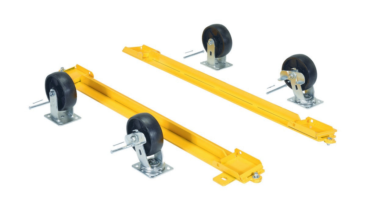 The adjustable pallet stand is designed to manually adjust to three (3) different ergonomic working heights. The stand includes a three (3) position manual adjusting bar with spring assist to help raise and lower the deck. The pallet stand must be empty when adjusting the height. This stand has a manual carousel that allows full rotation of products while on the pallet stand and it rolls smoothly on two (2) phenolic rigid and two (2) swivel casters with a brake.