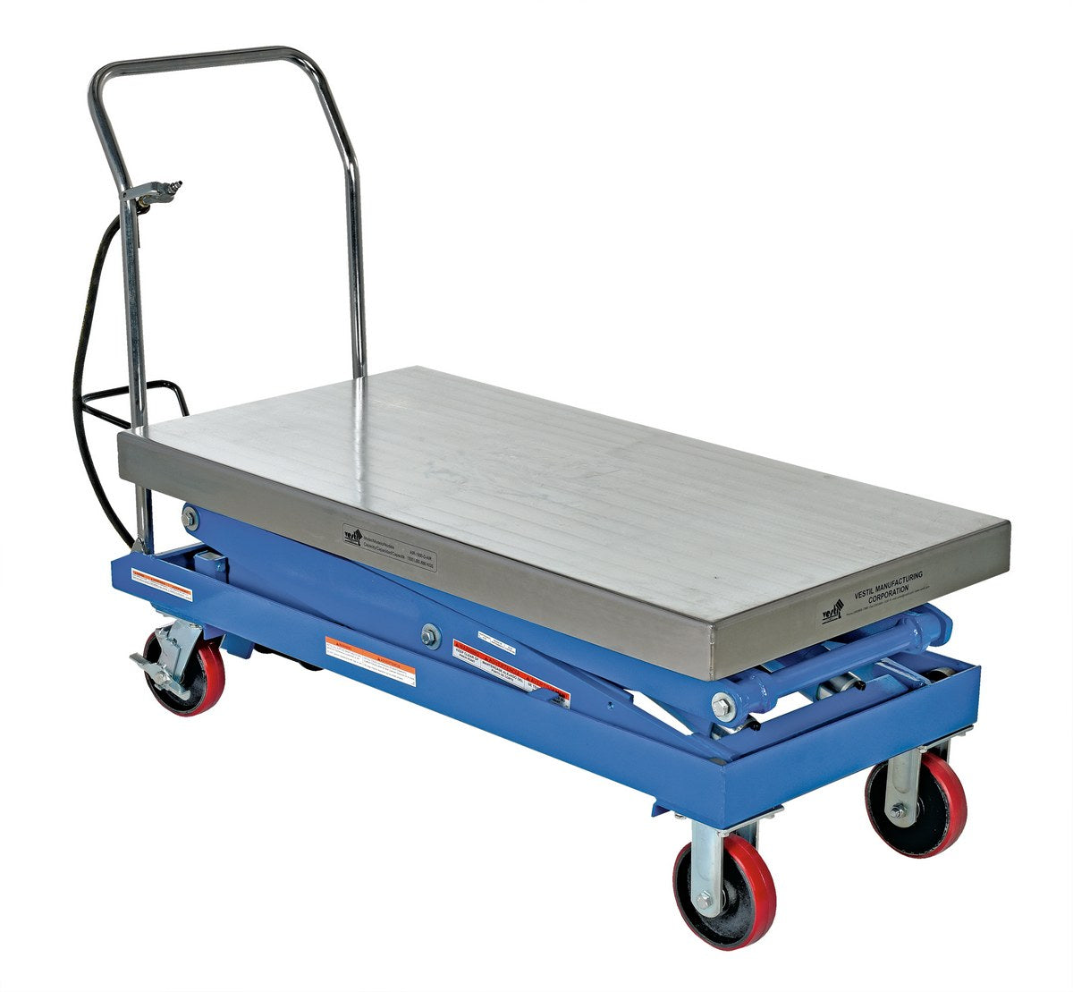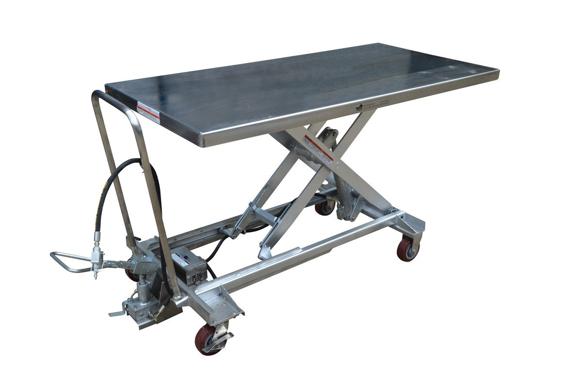 The air Hydraulic cart features a two speed foot pump and hand held reciprocating air/oil power to raise the platform. It utilizes the two speed foot pump for minor height adjustments and the factory air/oil power for effortless lifting. The platform, frame, handle, caster rigs, and hardware are all stainless steel. Pump assembly, hydraulic cylinder, and scissor legs are zinc plated.