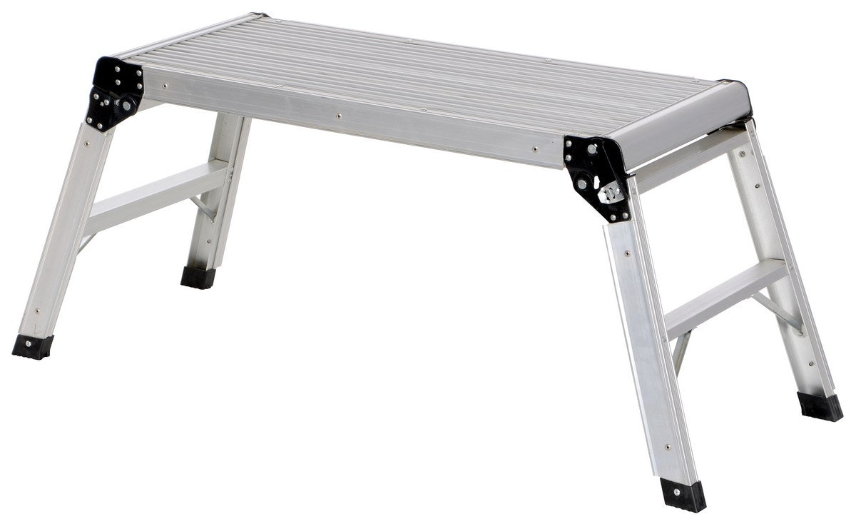 The Aluminum folding step platform with tool tray is perfect for getting that extra reach when pulling parts, painting, washing vehicles, or maintenance needs. Non-skid feet on each leg provide a secure grip, even on wet concrete, yet will not mar expensive epoxy garage floors. Lightweight construction for easy transport. When not needed, the legs fold under the platform for easy storage.