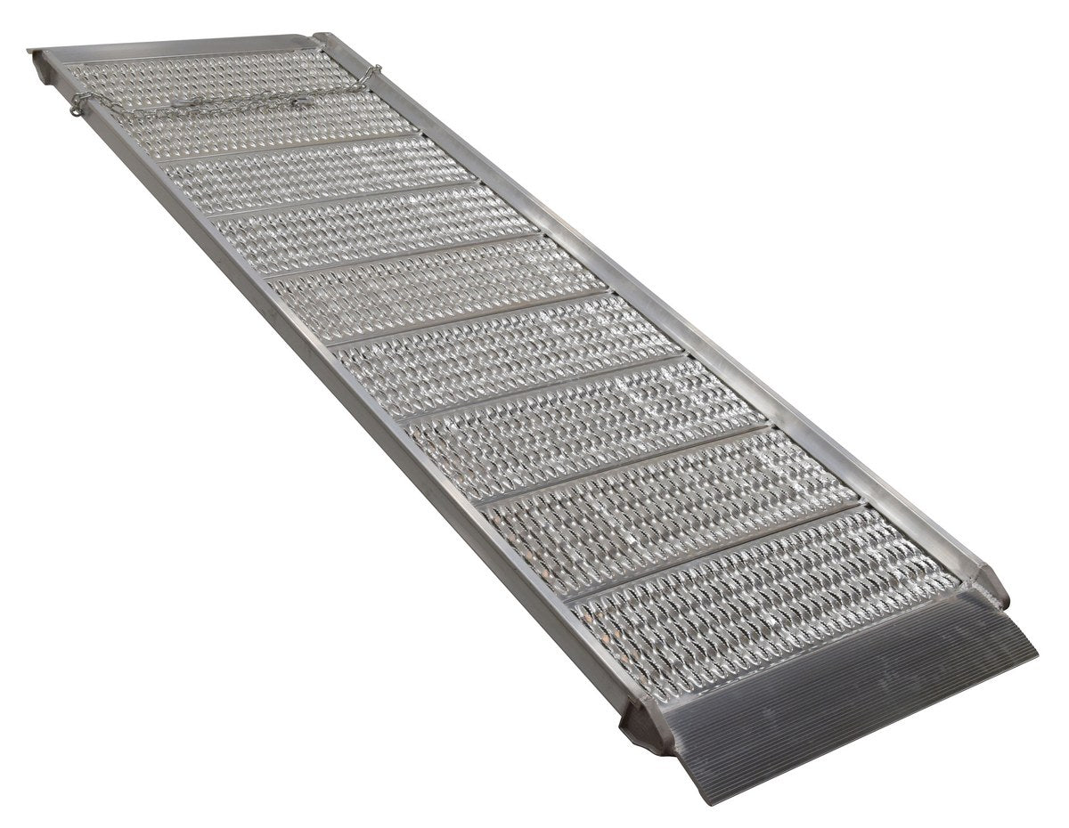 Load and unload trucks when docks are unavailable with the Aluminum grip-strut Walk Ramp. The open deck design allows snow, ice and water to fall through ramp providing a positive grip for delivery men/women, shippers and receivers. One hundred (100) percent welded aluminum construction is lightweight and will not rust. Overlap style end lip rests on the trailer bed to provide a smooth transition. Each unit includes two safety chains to connect the ramp to the trailer for safety. Not for pallet trucks or three wheel carts.