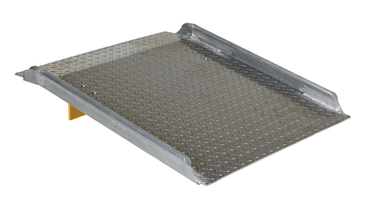 The Aluminum Hand Truck dock boards are lightweight and can be carried and positioned by one person. Provides a safe and convenient bridge between dock and truck. Welded aluminum diamond tread surface and beveled edges provide safe and smooth entry and exit. The bend is designed to keep ramp edges flush with the dock surface and the truck floor. The unit is equipped with bolt-on locking legs and full length aluminum curbs that provide hand holds and reduce chance of roll off. Designed for use with two wheel hand trucks.