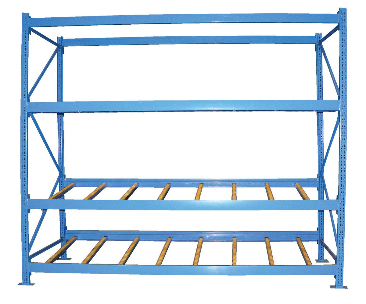 Each model by Gold Key Equipment is 84 "high and requires assembly to join it. However, units can be connected for more depth and have a baked-in powder coat finish for increased robustness. The storage level for gravity flow includes one cross support, five box guide rails, and four pairs of roller tracks.