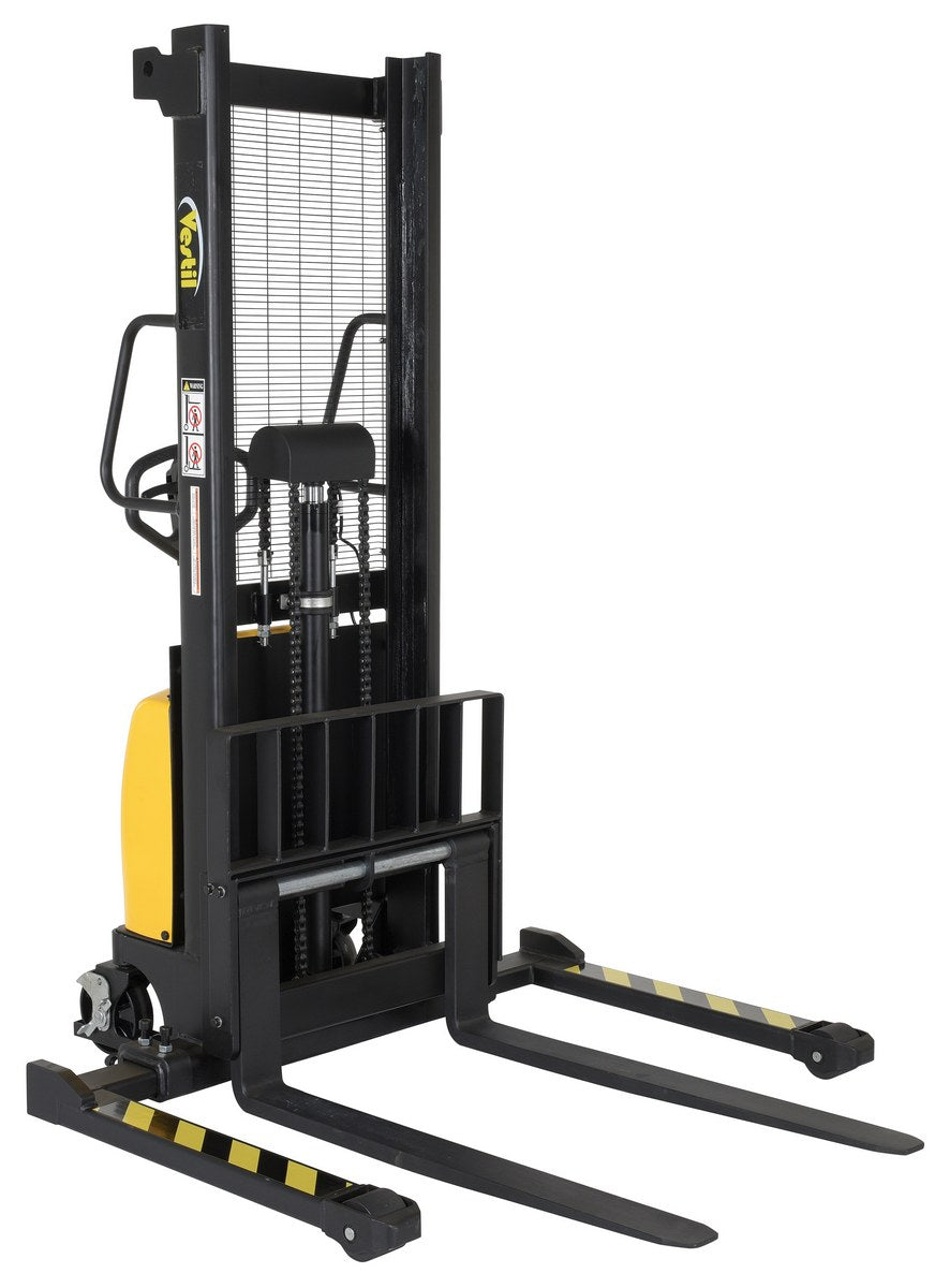 An economical alternative DC powered lift stacker. Ideal for maintenance and commercial applications. This unit can be used as manual hand pump lift or electric powered lift. Ideal when power is not available. High quality hydraulic pump and DC lift system. Compact design and strong steel construction. An economical lift to handle tasks such as transporting dies, molds, and skids. Powered with two (2) 12V AGM batteries. Integral battery charger, battery level gauge, and adjustable lowering speed. All models are easily maneuverable using the standard pull handle. Forks measures 26." wide by 42" long. Individual forks are 6" wide.