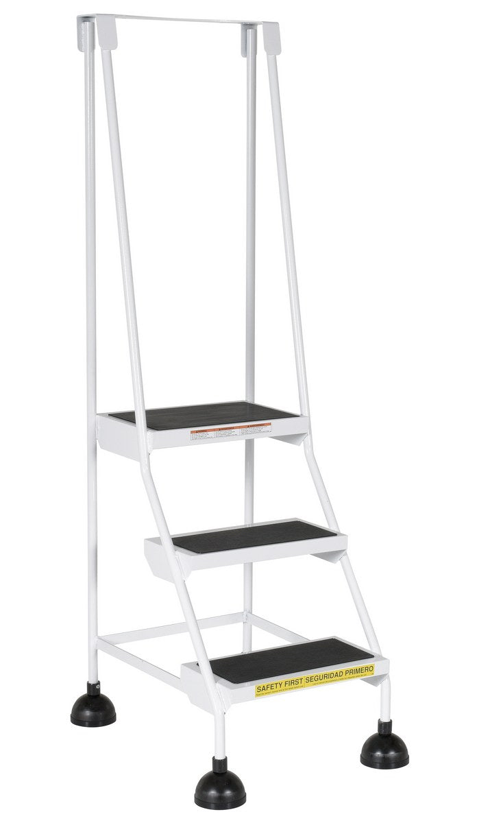 Commercial users of rolling ladders now have an attractive and economical alternative to the traditional warehouse rolling ladders. This commercial spring loaded ladder has a sleek design, also provides maximum safety and convenience. The all directional spring-loaded swivel casters feature steel dome protection and include rubber pad bottoms to minimize movement. This ladder has perforated steps. The powder coat finish provides a durable attractive appearance.