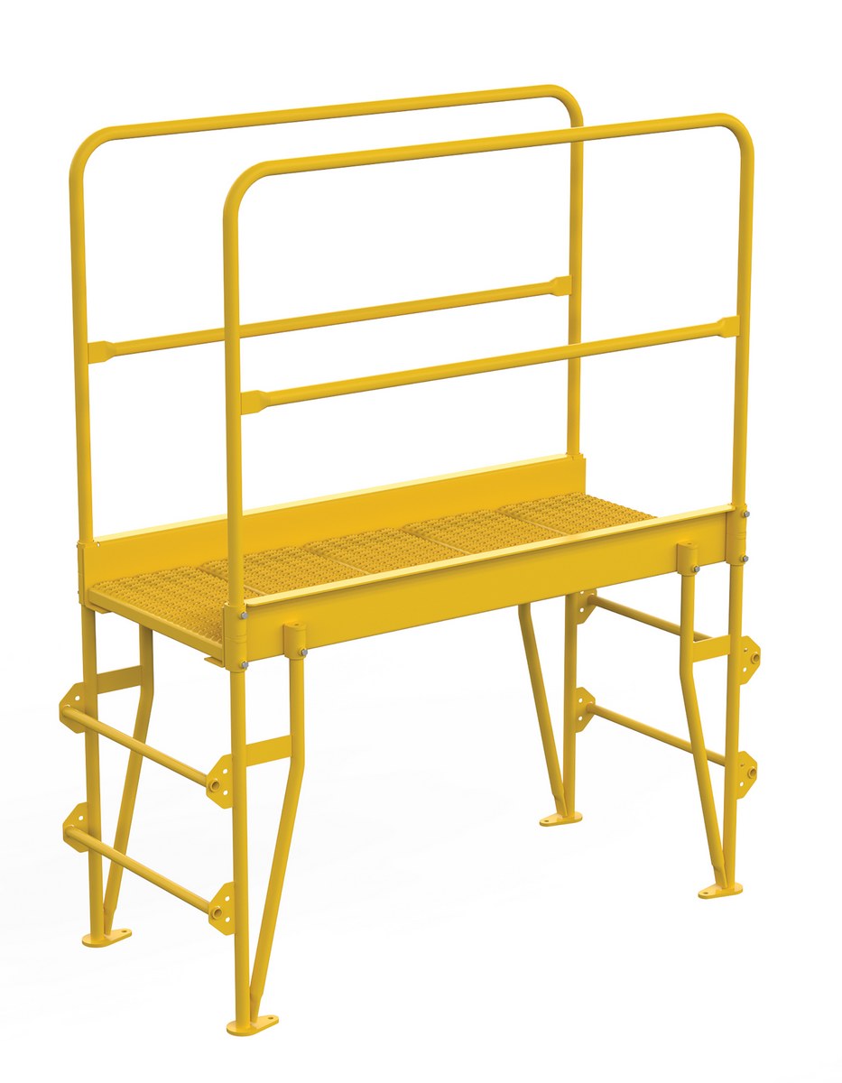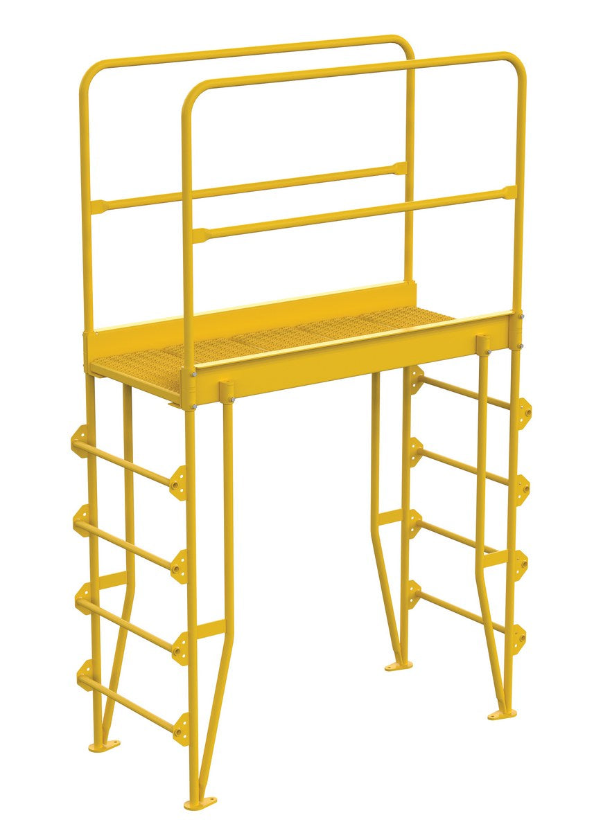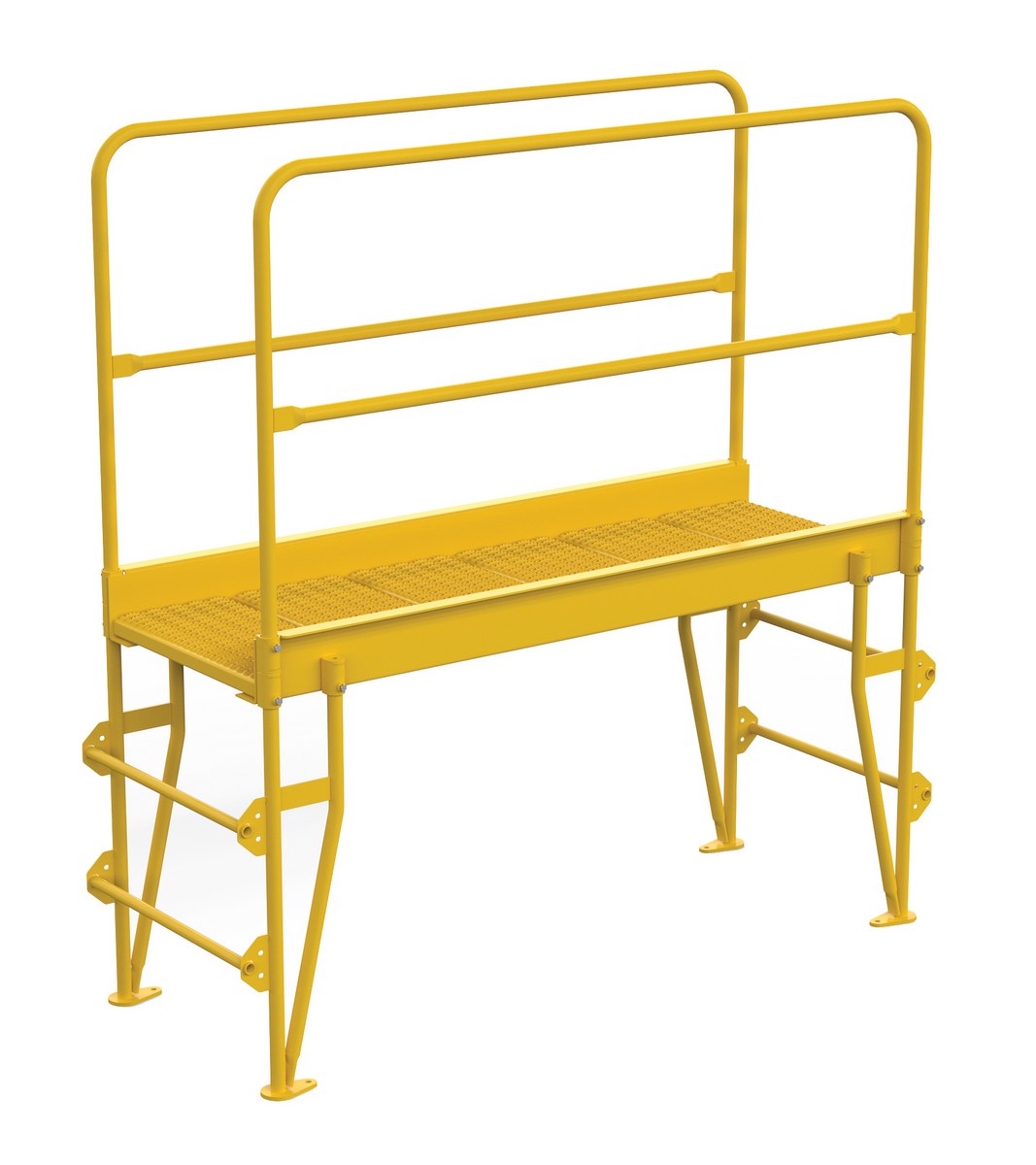 Mount where you need permanent access at crossover points. The upper platform features removable handrail and fixed toe boards to prevent objects from rolling off. Serrated platform for extra grip. Top half of steps covered in grip material for safety. Ground legs include floor mounting pads. Units must be anchored to the floor. Units are all steel construction and can be knockdown for storage and shipping. Meets OSHA 29 CFR 1910.27. Baked-in powder-coated toughness.