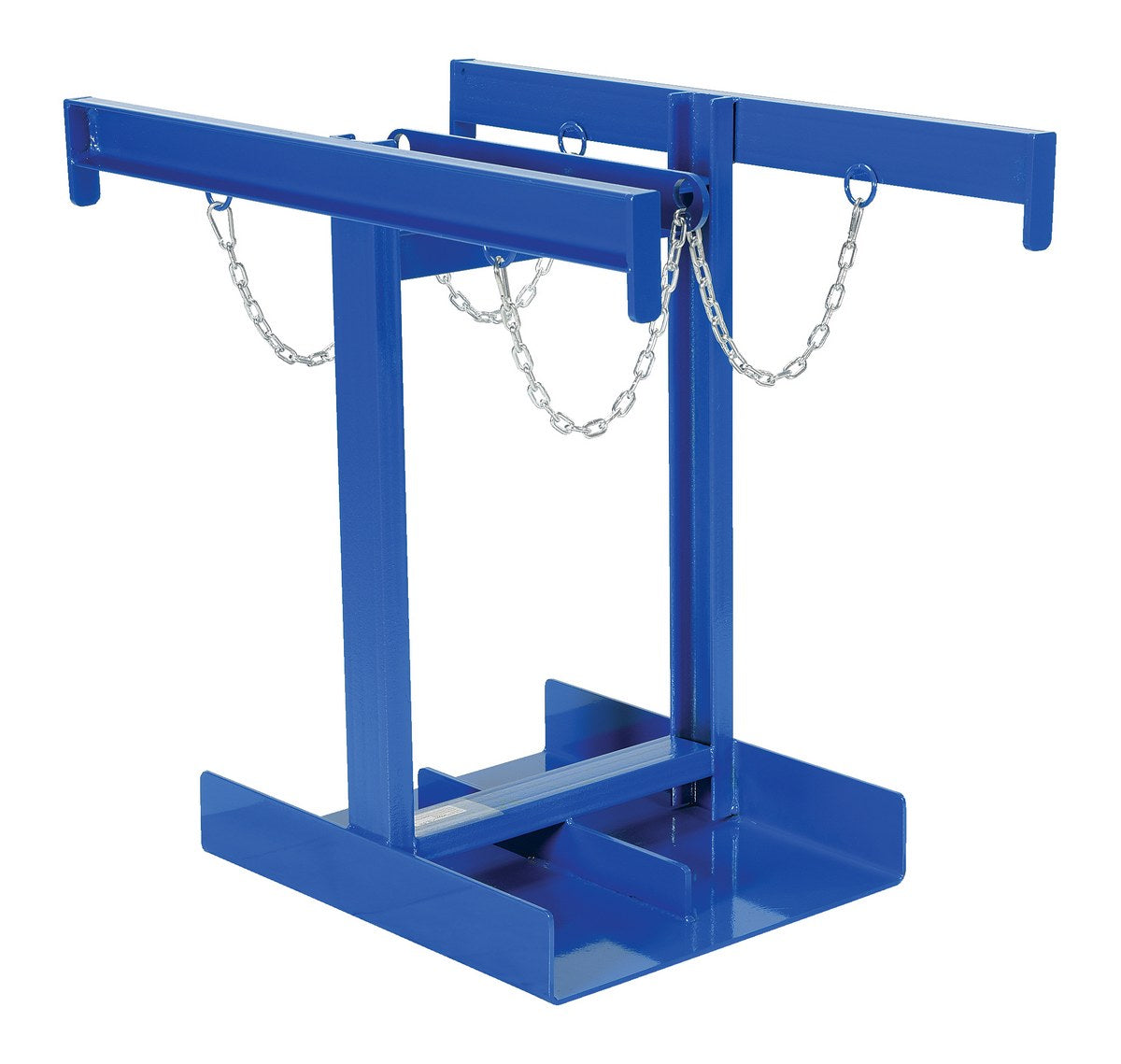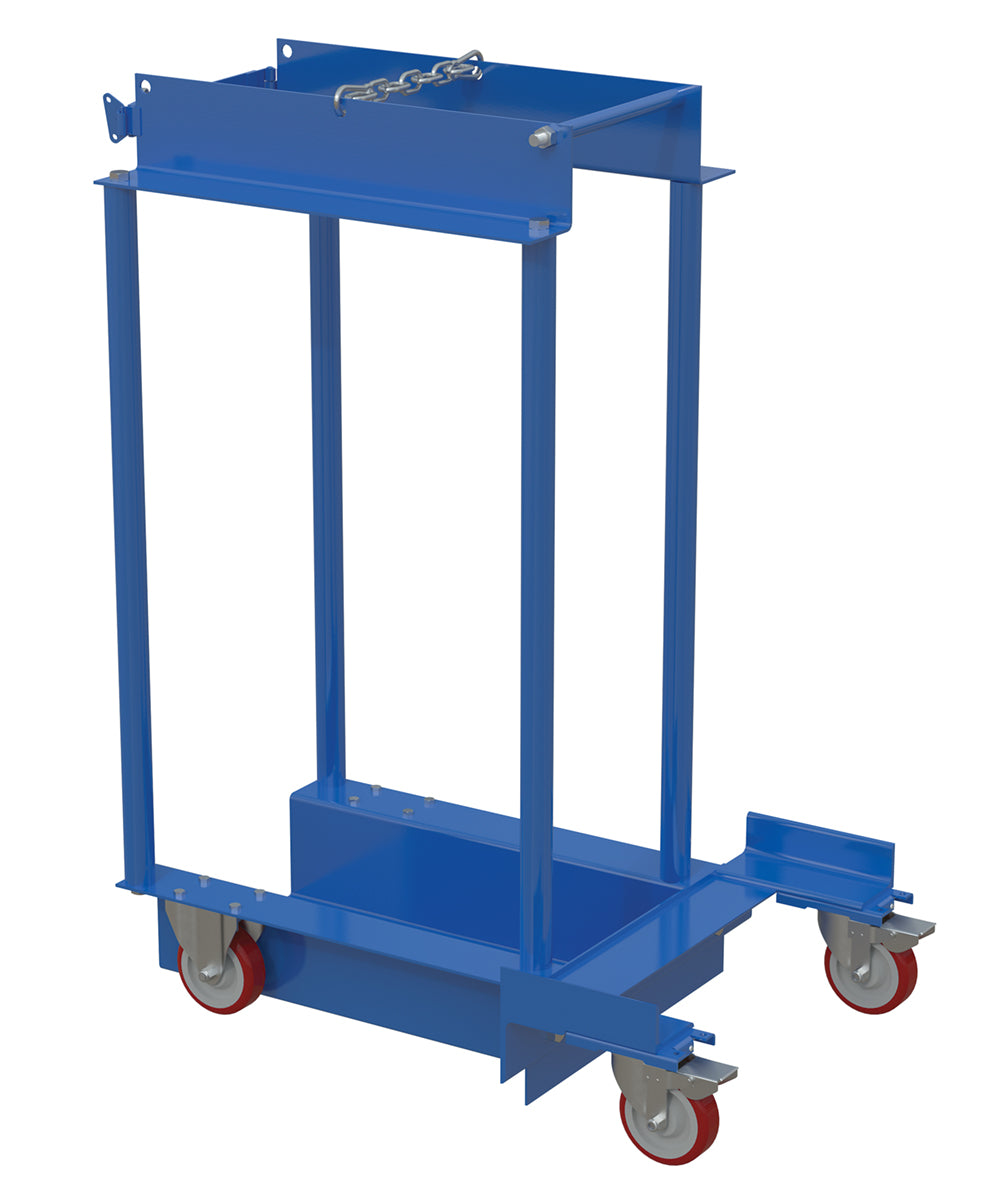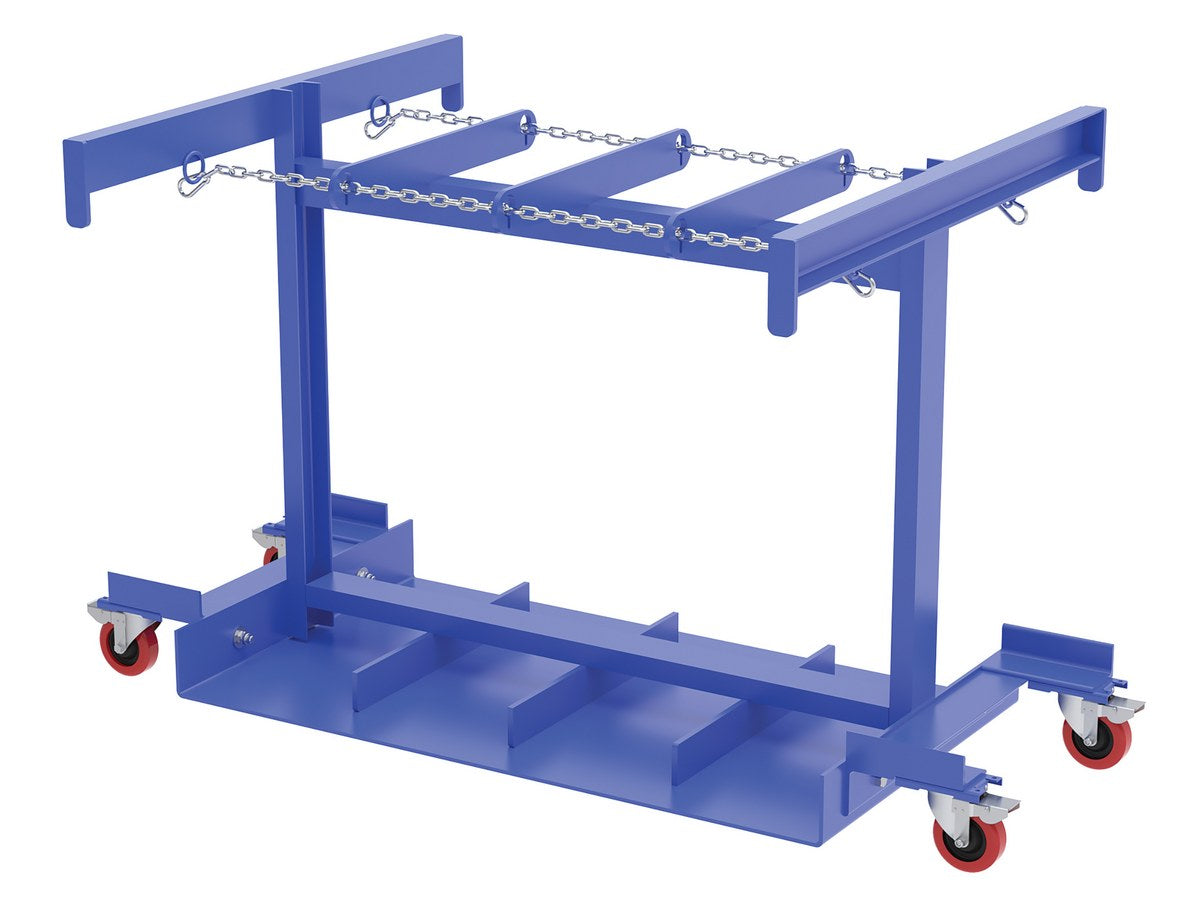 A Cylinder truck transports cylinders safely. This unit comes complete with safety chains to secure the cylinders in place. Made of all steel construction. The casters allow for portability without the need of a fork truck or pallet truck.