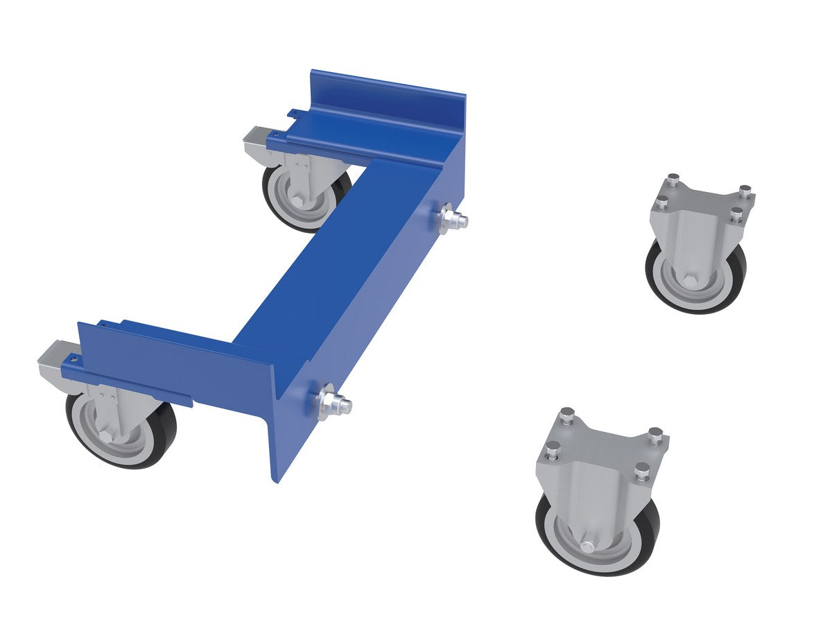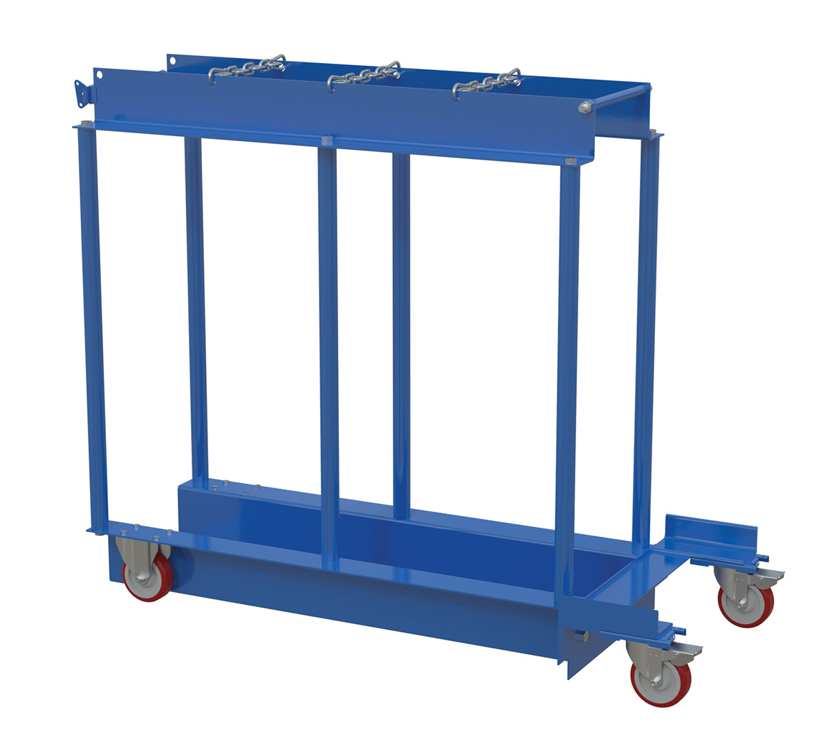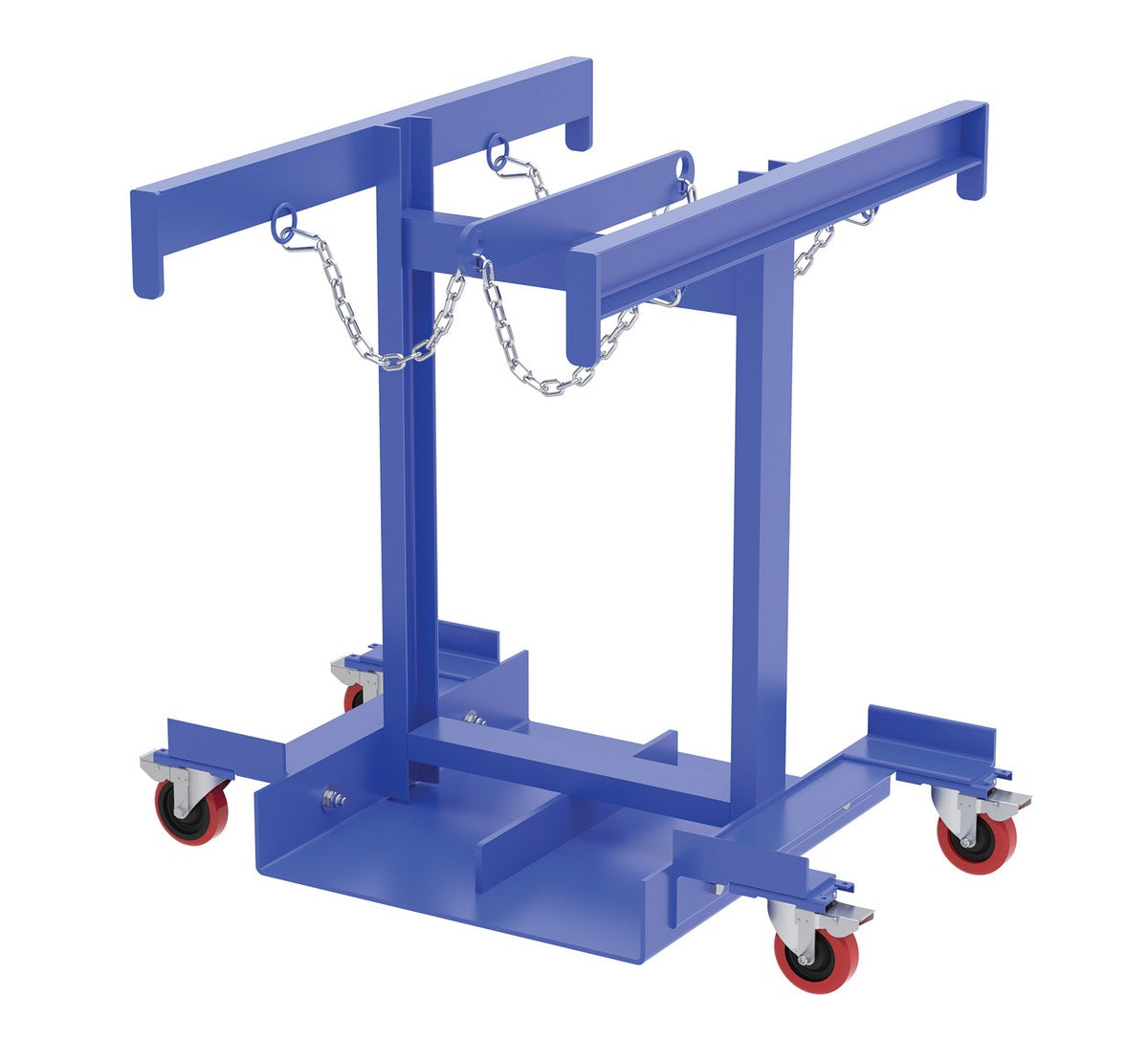 A Cylinder truck transports cylinders safely. This unit comes complete with safety chains to secure the cylinders in place. Made of all steel construction. The casters allow for portability without the need of a fork truck or pallet truck.