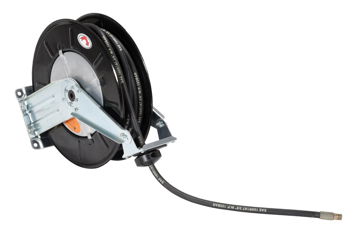 This deluxe spring driven low pressure hose reel keeps the air hoses off the floor and out of the way. Minimize labor, save storage space, protect against trip hazards and damaged hoses. For use with air and water only. Solid steel construction with heavy-duty brackets to resist hose pull. Reel has a full shaft and swivel to assure maximum product delivery. Includes self retracting hose.