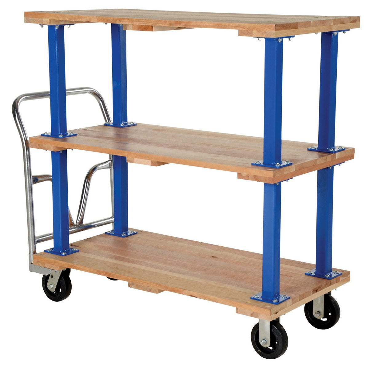 Minimize lifting and bending with this double decker Hardwood platform cart/portable work bench. Ideal for shipping areas, offices, and plant use, these economical carts are perfect for many of your applications. Removable push handle is chrome plated. Countersunk holes allow for a smooth deck surface.