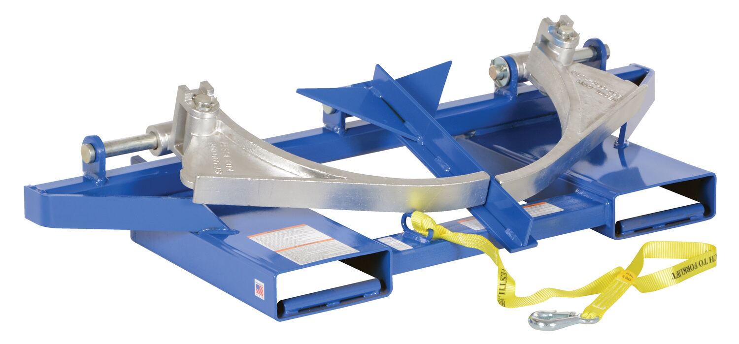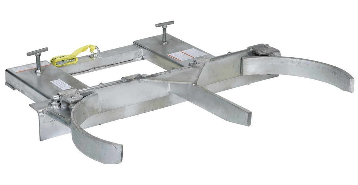 The drum gripper makes it easy to pick up steel and plastic drums (with top ring or top ridge) without leaving the seat of the fork truck. Simply slip the forks into the fork tubes and the drum gripper is ready to go. The adjustable width arms systems grips the drum tightly, and then lifted into the air. Drum is automatically released by lowering the forks. All models feature hinged folding design for storage. The unit is constructed of powder coated welded steel for strength and durability throughout daily use. Safety restraint included.