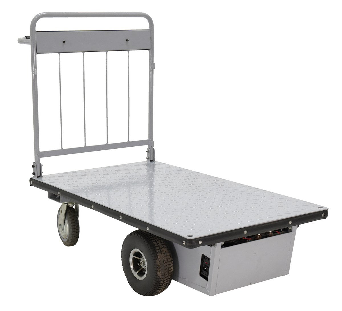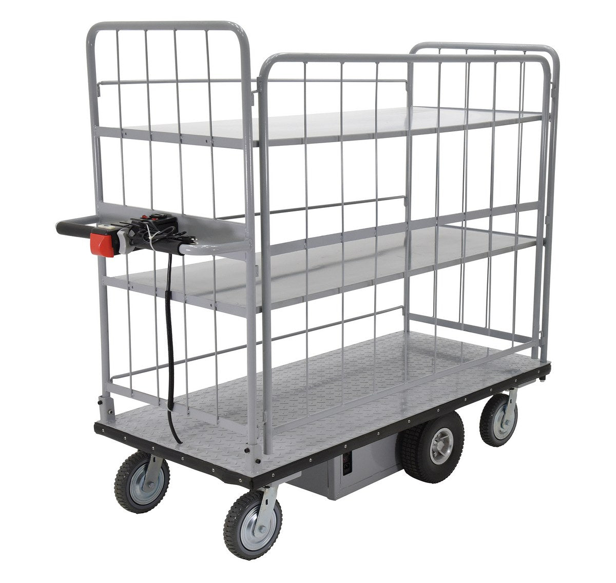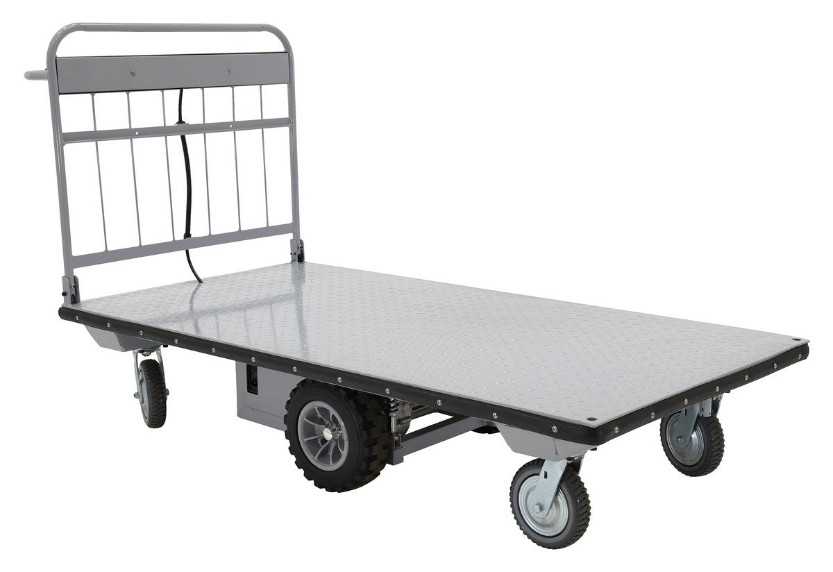 Electric material handling carts are ideal for moving heavy loads safely and easily throughout warehouses, offices, schools, and hospitals and incorporates a multitude of features to make light work of heavy loads. Reduce injury and increase productivity with these high quality carts. Features an 800W electric drive motor with (2) two 12V batteries for power and on-board 115V AC battery charger. The handle includes forward and reverse throttle control levers, an emergency reverse switch, a battery level gauge, and a slow/fast speed switch. Pinpoint turning is accurate with the mid-axle drive feature.