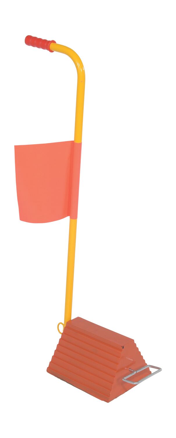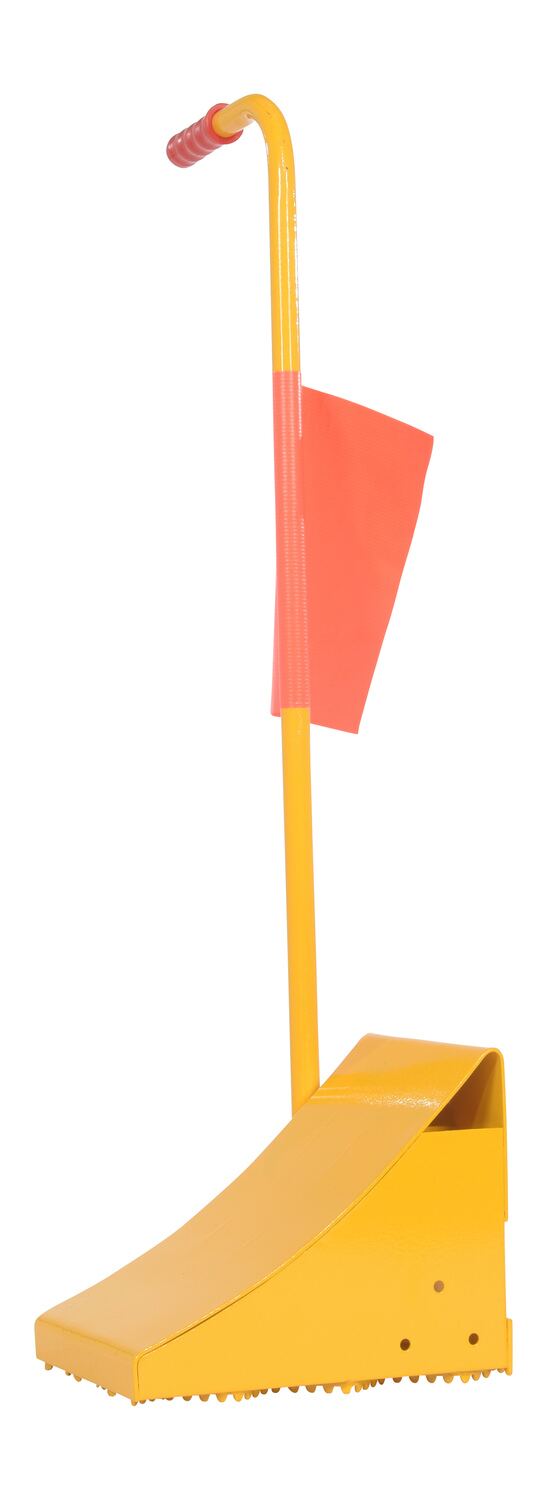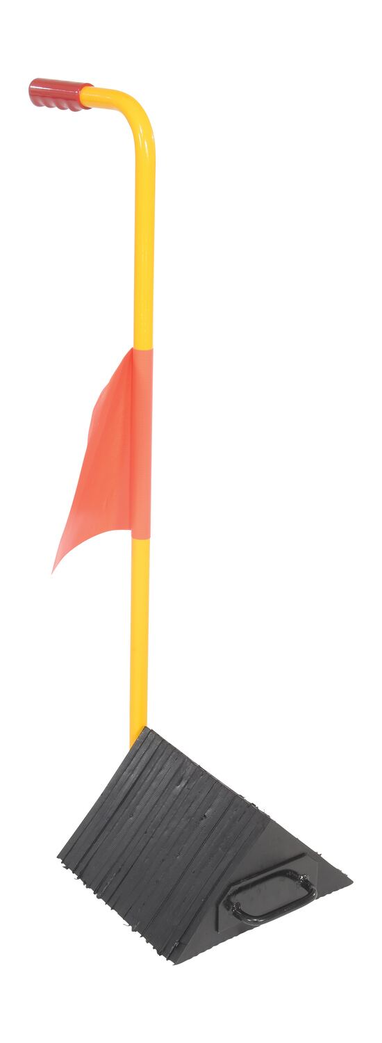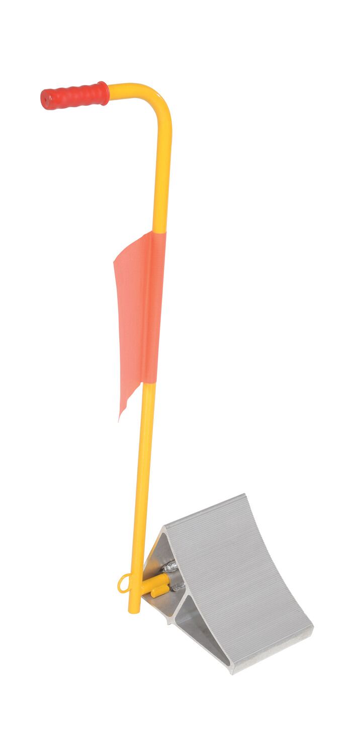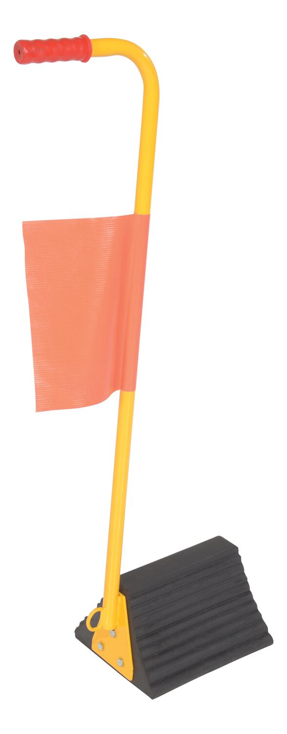 The fabricated ergo-handle Wheel Chock has an ergonomically design that makes it easy to move wheel chocks in and out of position under trailer wheels. It reduces the risk of back, knee, and foot injuries. The handle is constructed of steel and includes a yellow powder coat finish. Assembly required. D-ring provided for attaching security chain. Chain not included.