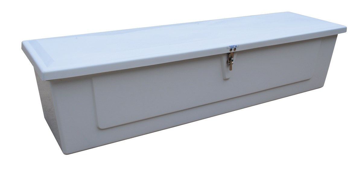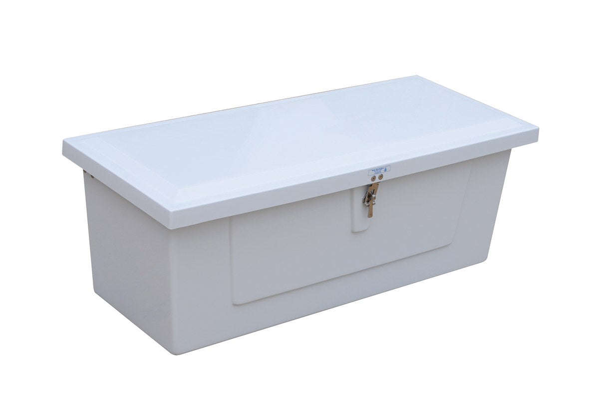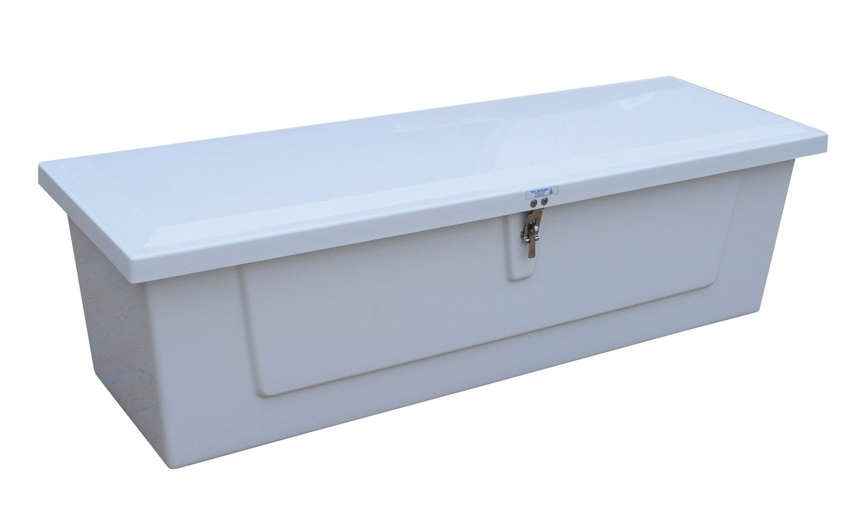 This lockable Fiberglass storage case is constructed of heavy-duty white fiberglass with an off-white interior finish. The case is perfect for storage of hundreds of items. UV gel coat topcoat provides long-lasting protection and prevents fading. Gas cylinders are included to help lift the lid and prevent the lid form over-rotating and damaging the hinges. The hinges are stainless steel piano hinges attached with adhesive and rust-proof rivets.