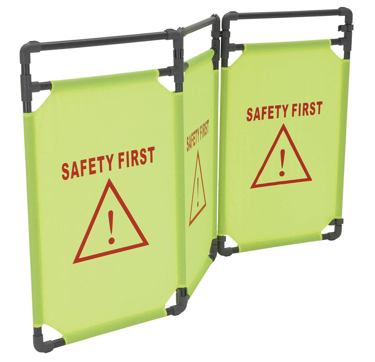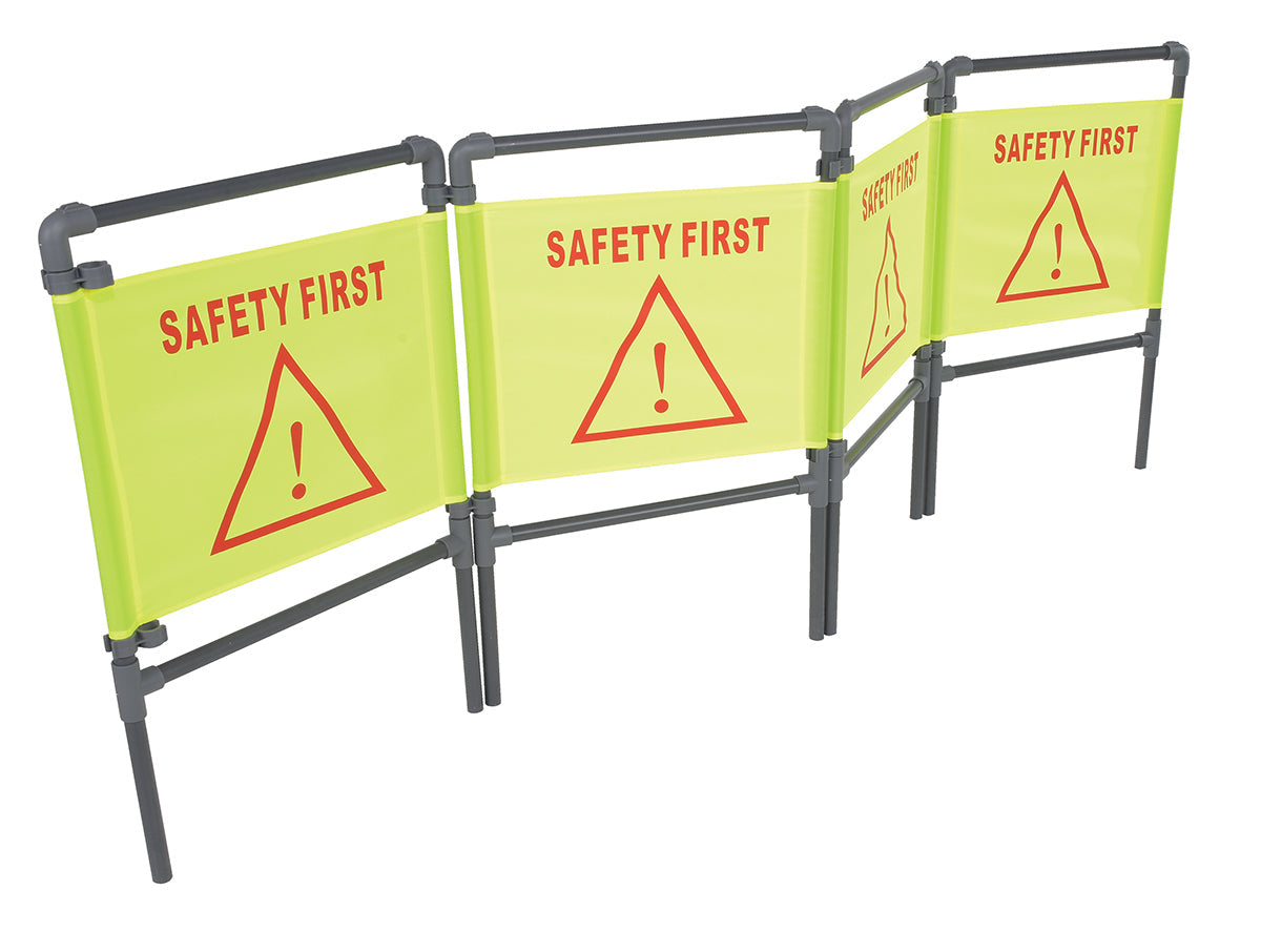 The lightweight and portable three (3) section design folding fabric barrier can be folded into various configurations. The barrier alerts people to hazards with the alert yellow/green fabric and safety first marking. The fabric material is water and mildew resistant polyester. The barrier is constructed of gray tubular plastic and folds flat for storage.