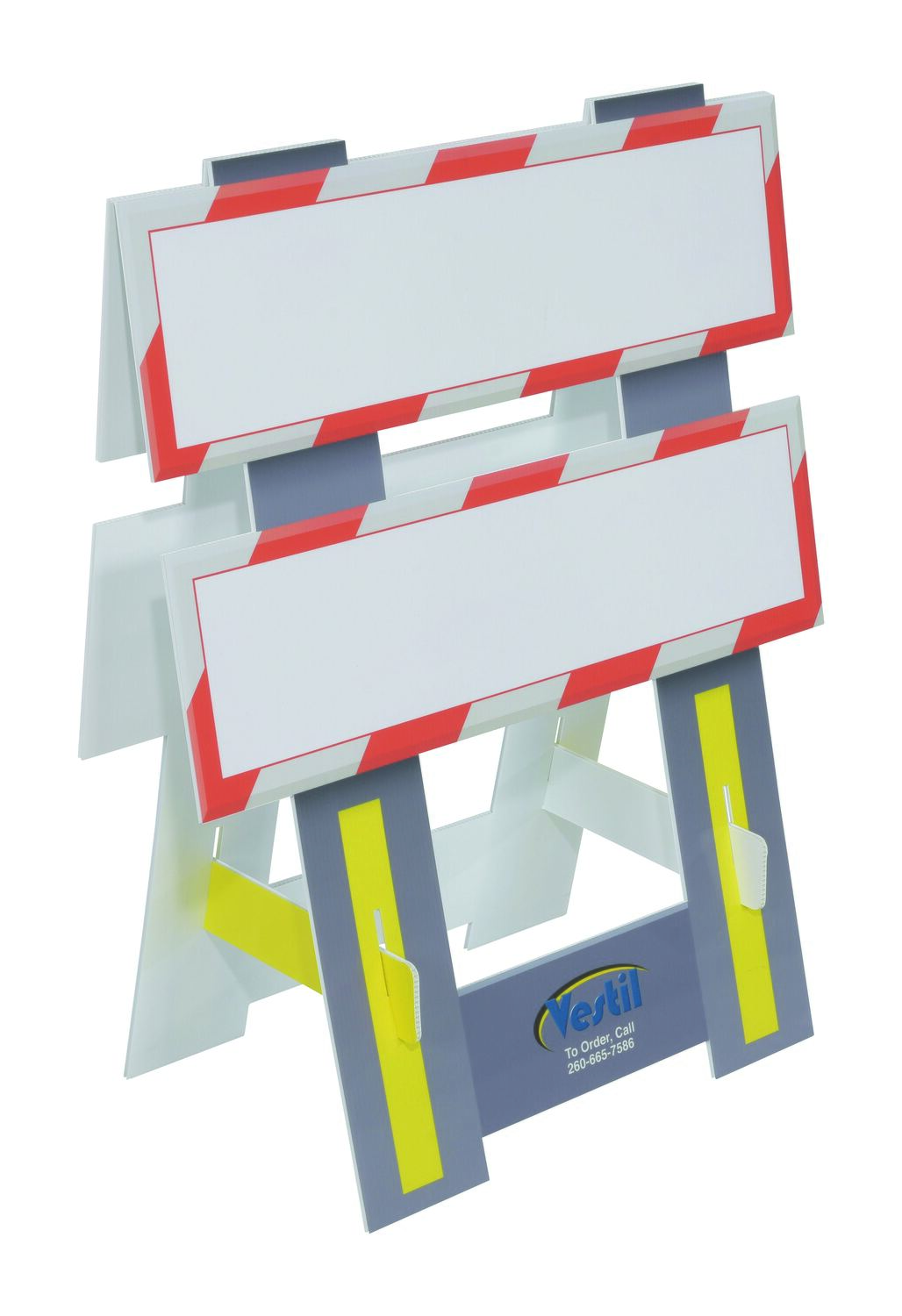 A folding safety barricade blocks access to areas, while also conveying an important message. The plastic construction is durable for consistent use in a wide array of situations. With a lightweight design the unit can be transferred between areas quickly and easily. When in place, the height and width of the barricade provides personnel with area awareness.