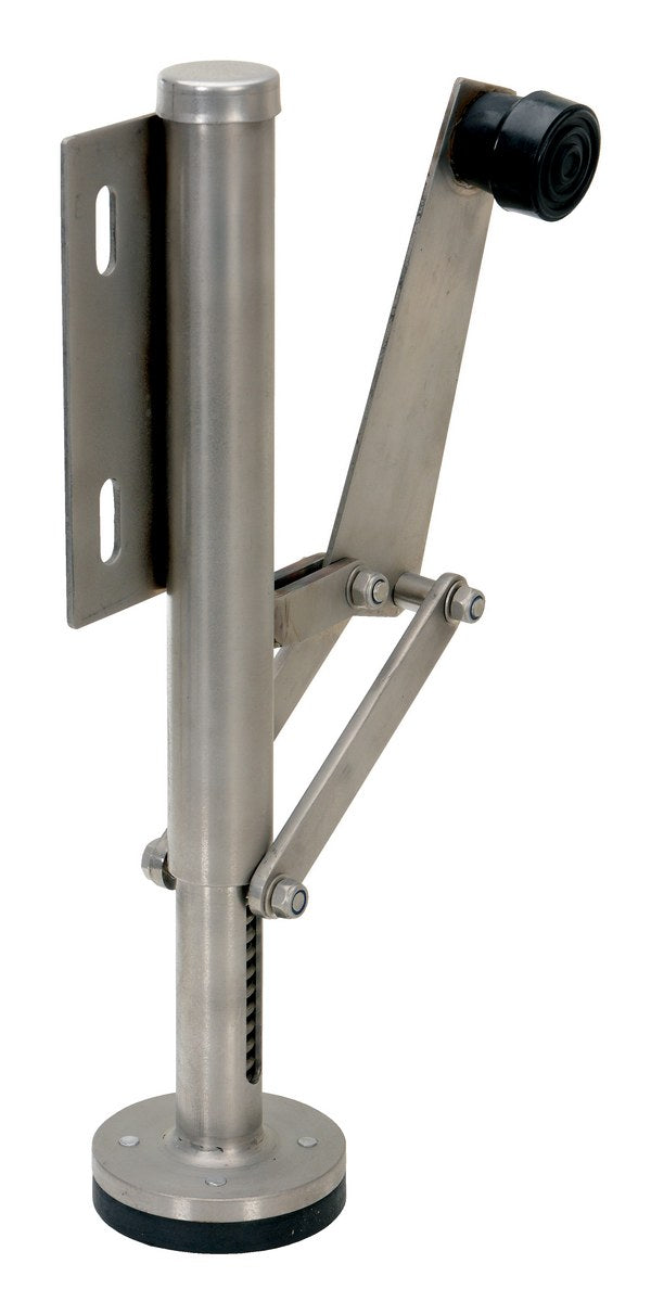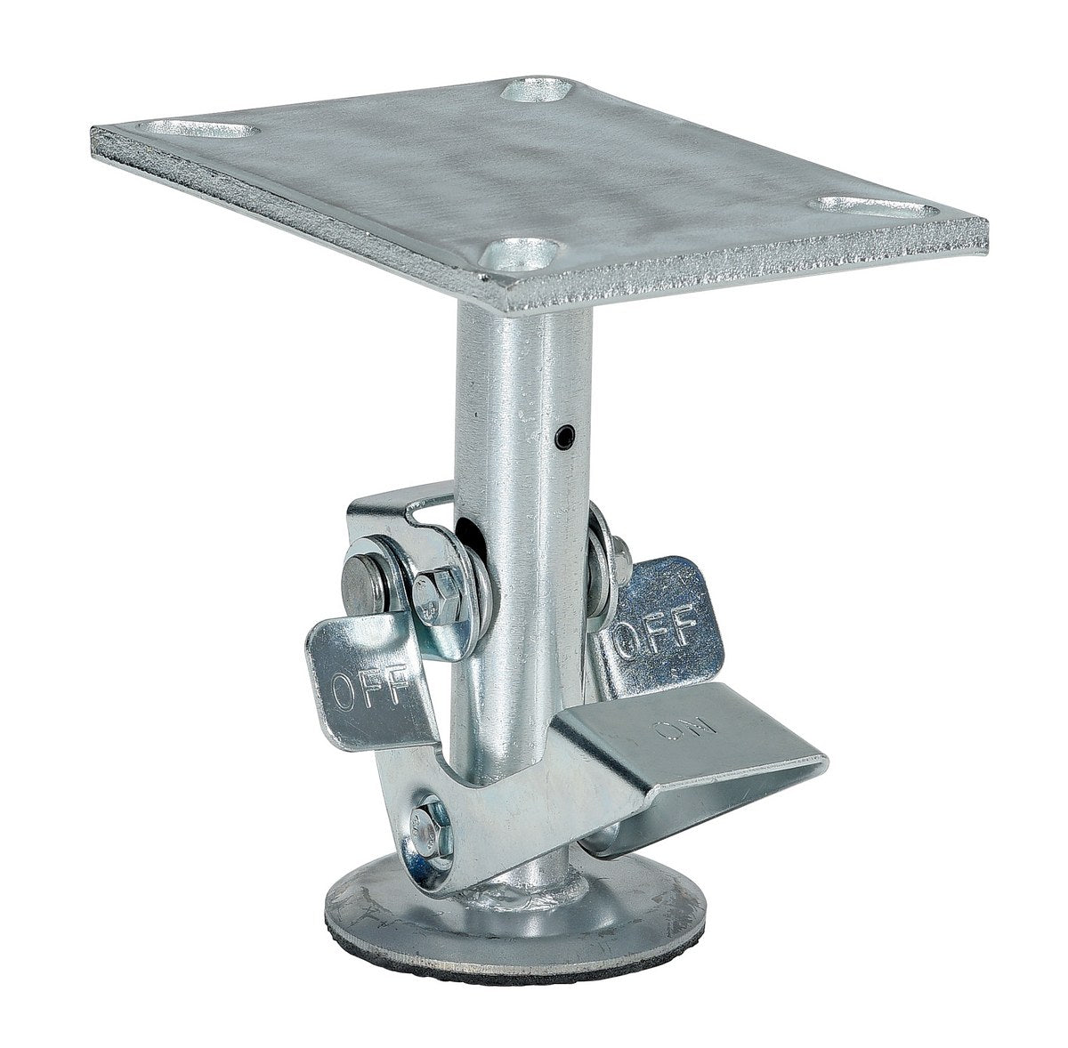 Floor locks may be used on platform trucks, fixture dollies, or equipment with casters. Simple foot pressure immobilizes equipment. Locks when large friction face is pressed against the floor. To release simply kick release rod. Brake is independent of casters and can be installed to any convenient location on the cart. Vertical mounting plate designed to mount to sides of carts and other portable products. The spring loaded pad accommodates uneven floors. Units mount with pad 1." off the floor when retracted.