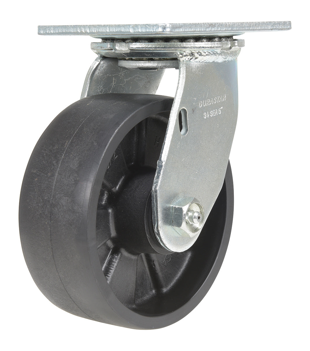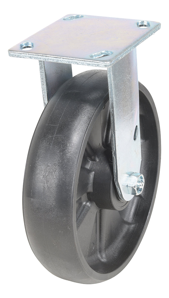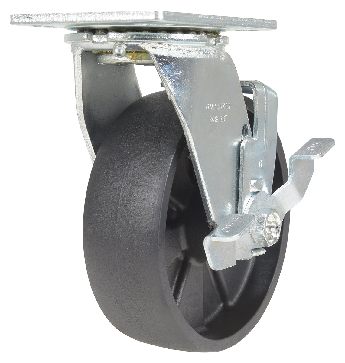 Made of high-tech proprietary glass filled nylon. Provides better impact resistance than standard glass filled nylon. Does not absorb moisture like phenolic, and offers better floor preservation than steel or cast iron. Resists most chemicals, solvents, gases, acids and steam cleaning. Wheel core material is glass filled nylon.