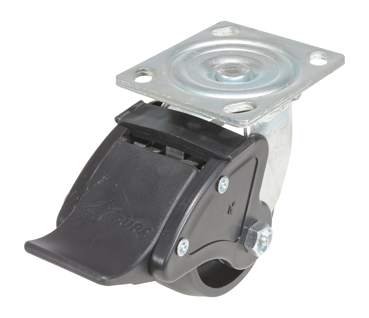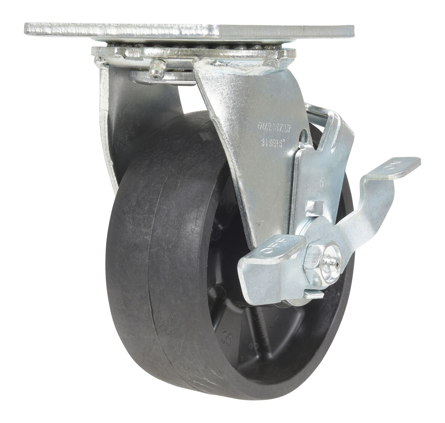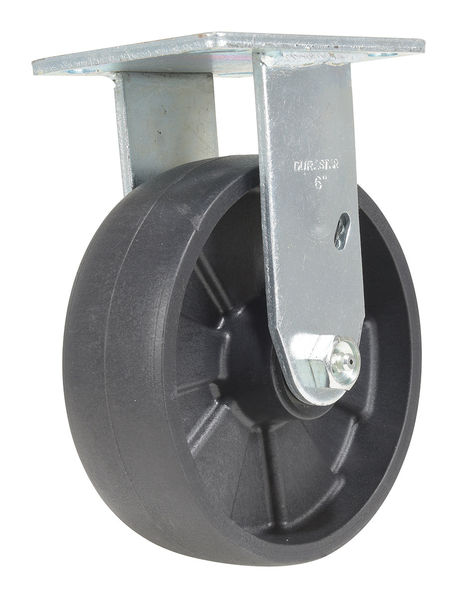 Made of high-tech proprietary glass filled nylon. Provides better impact resistance than standard glass filled nylon. Does not absorb moisture like phenolic, and offers better floor preservation than steel or cast iron. Resists most chemicals, solvents, gases, acids and steam cleaning. Wheel core material is glass filled nylon.