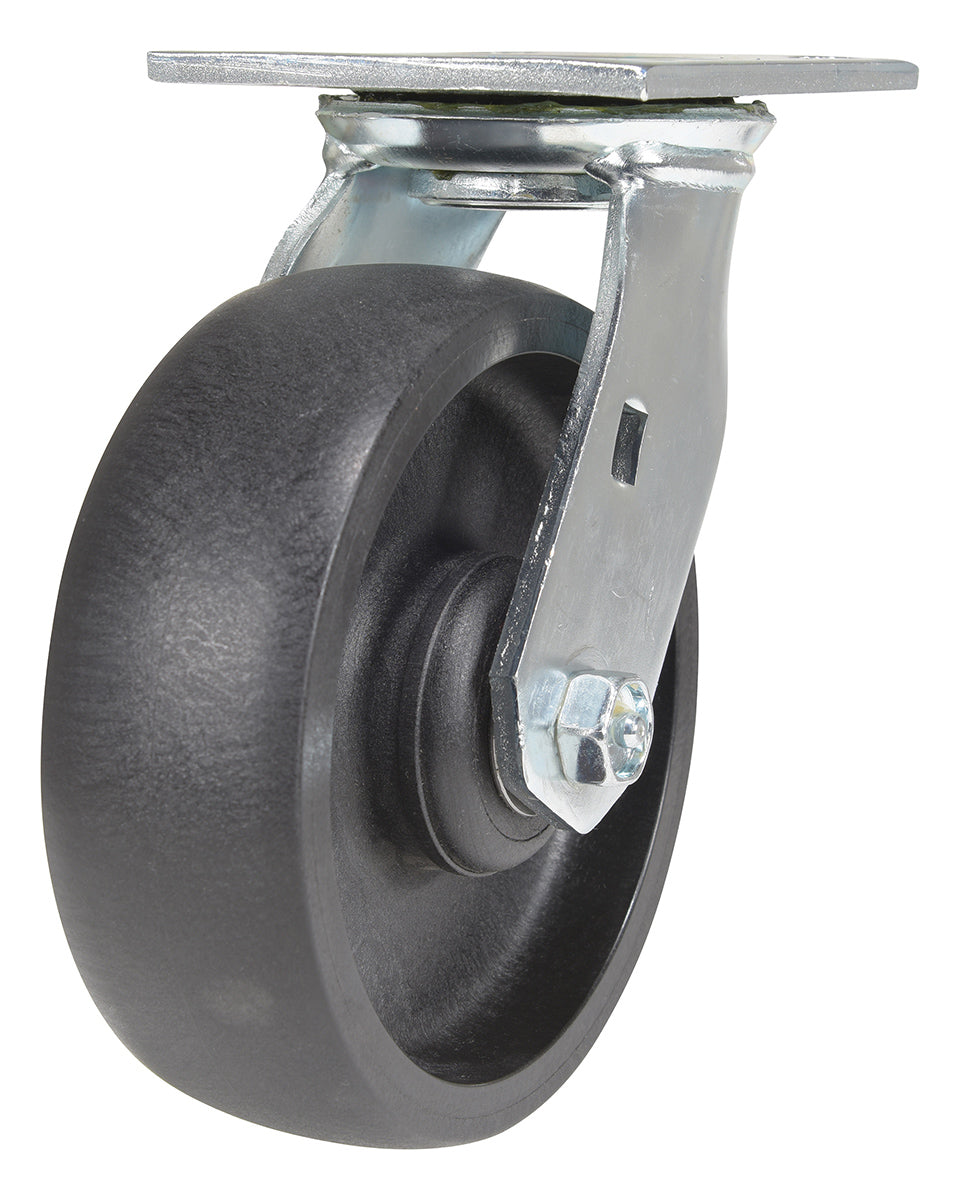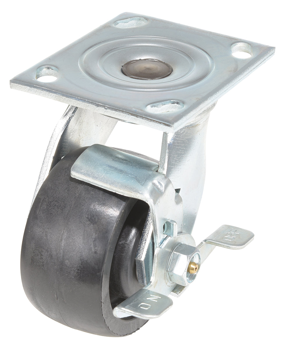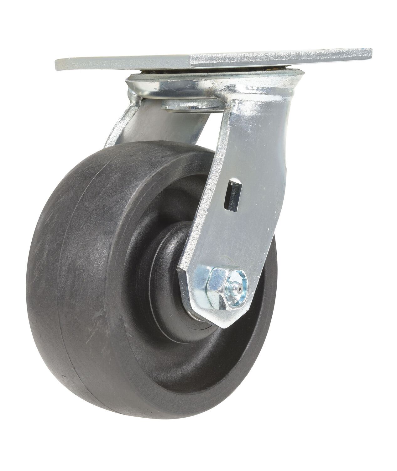 Made of high-tech proprietary glass filled nylon RX. Provides better impact resistance than standard glass filled nylon. Does not absorb moisture like phenolic, and offers better floor preservation than steel or cast iron. Resists most chemicals, solvents, gases, acids and steam cleaning. Top plate measures 4 x 4�". Black tread color. 85 (+/-5) Shore D. wheel core material is glass filled nylon.