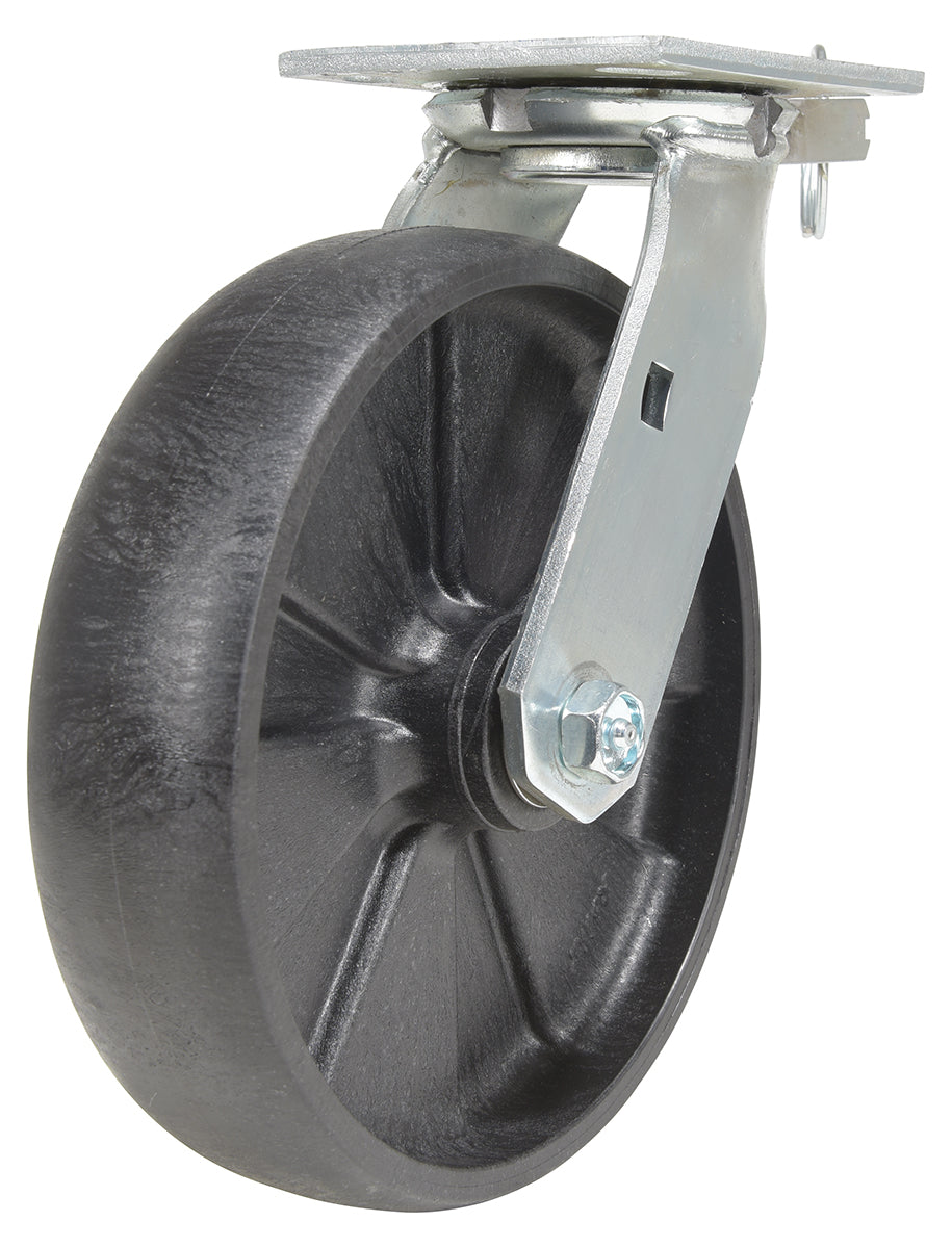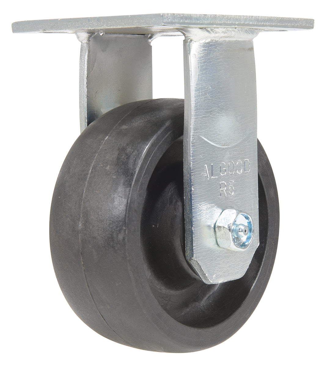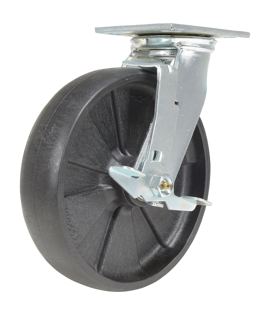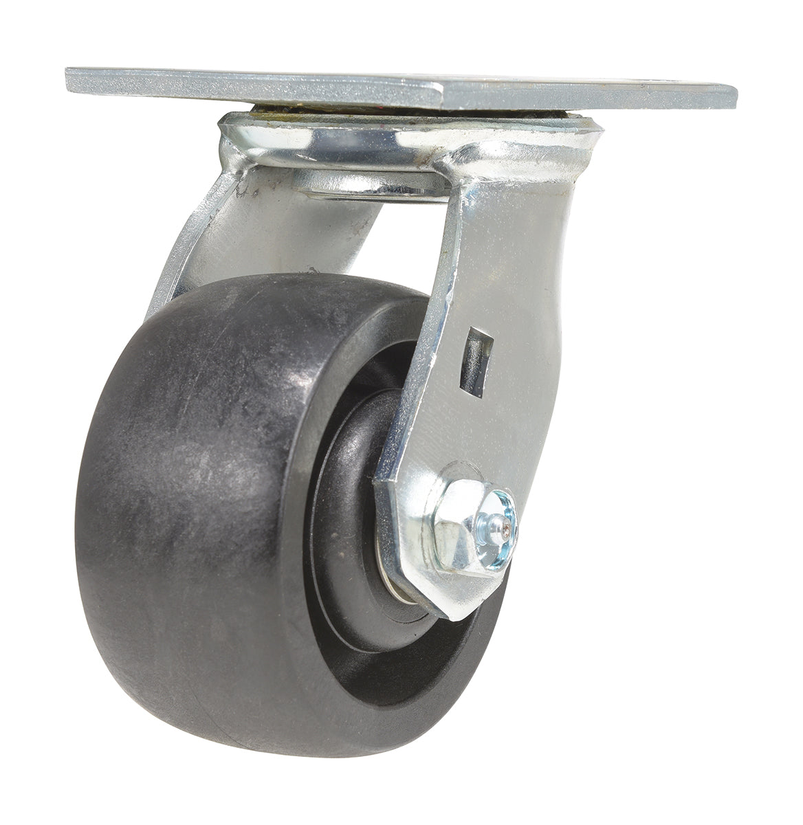 Made of high-tech proprietary glass filled nylon RX. Provides better impact resistance than standard glass filled nylon. Does not absorb moisture like phenolic, and offers better floor preservation than steel or cast iron. Resists most chemicals, solvents, gases, acids and steam cleaning. Top plate measures 4 x 4�". Black tread color. 85 (+/-5) Shore D. wheel core material is glass filled nylon.
