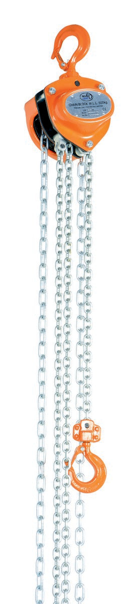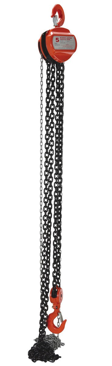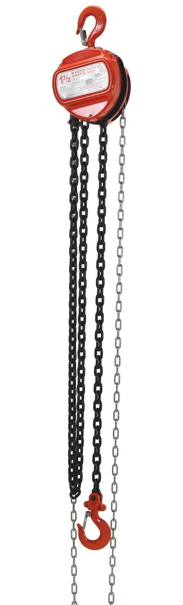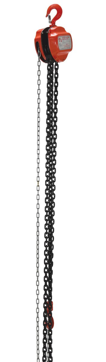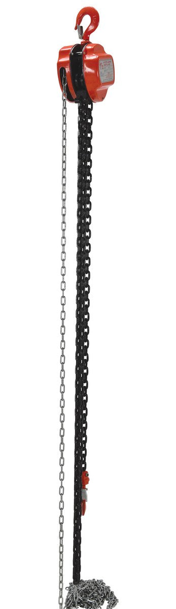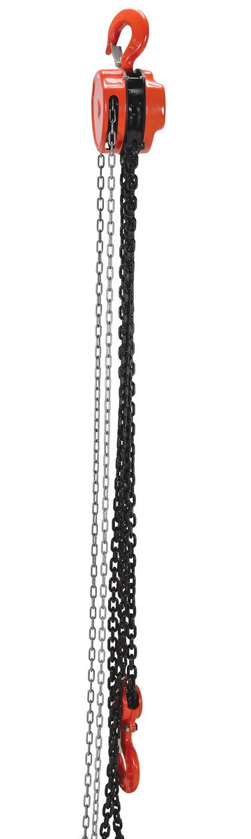 This portable, lightweight hand Chain Hoist is durable and easy to operate. Compact design and low headroom allow installation in confined areas. Enclosed double ratchet pawls with self adjusting disc brake standard. Designed with a safety factory four (4) times rated capacity. Individually tested at 150% rated capacity. Features black chain tempered to ISO 3077, pull chain, hardened two-stage gears and forged steel upper and lower hooks with safety latches. Constructed of high quality steel components ideal for industrial applications.
