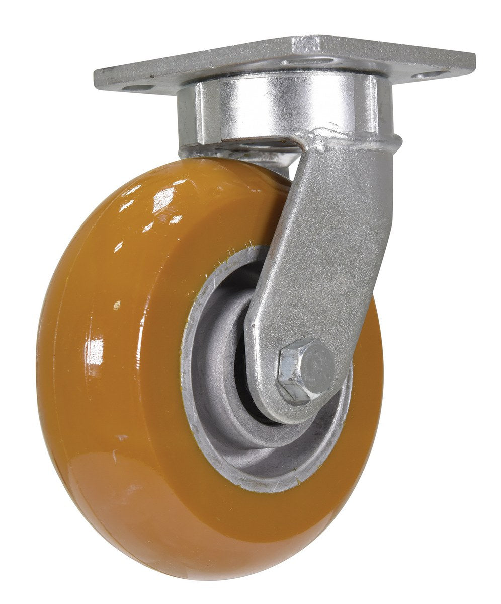 Made of proprietary polyurethane-elastomer that allows tread to retain its shape, reject debris, and increase its stored energy to boost ergonomic performance. This superior caster is designed to reduce the force exerted to turn or start rolling, even when all wheels are not parallel. It also features neoprene sealed precision ball bearings and hardened raceways, providing a smooth rotation with less effort. Caramel tread color. 83+/- Shore A. wheel core is constructed of aluminum. Made in the U.S.A.
