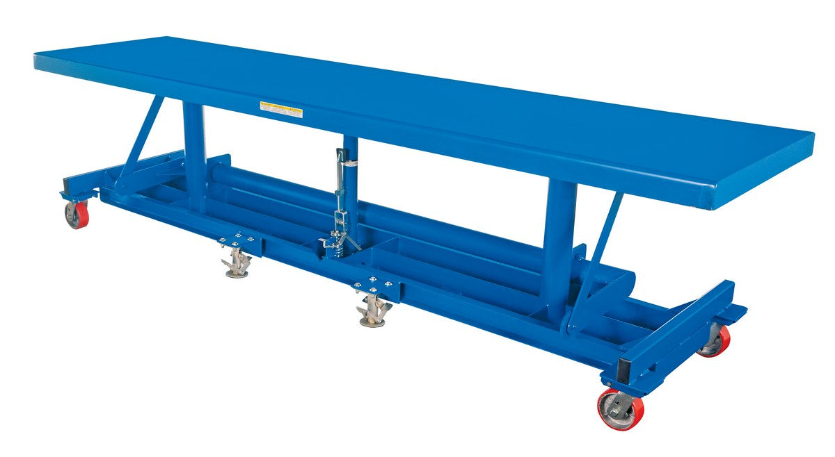 The long deck cart is perfect for sheet and strip handling, ergonomic load positioning, and handling long awkward material loads. The platform height is adjusted with manual hydraulic foot pump. The structural steel base helps to distribute the load evenly. Unit comes standard with four (4) swivel poly-on-steel casters and dual floor locks.