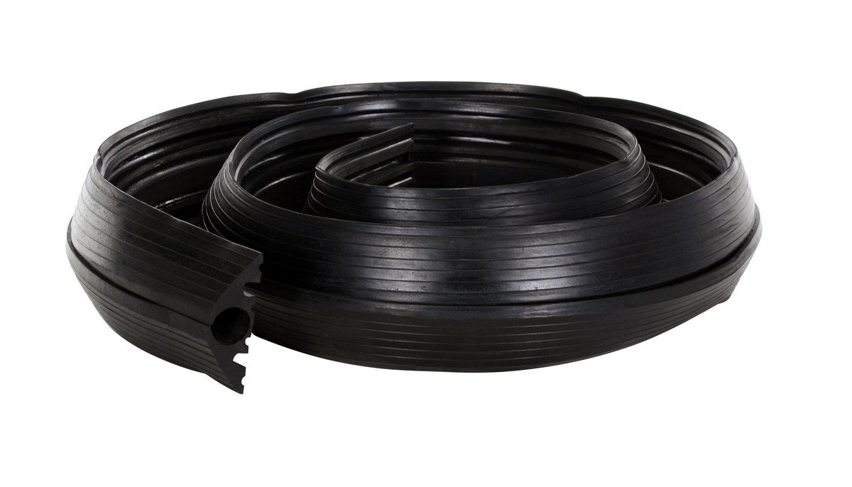 The Long Extruded Rubber Cord Protector protects temporary wires and cords from moving vehicles. There are 1/2 in. bottom holes, and they prevent rips and fallings.