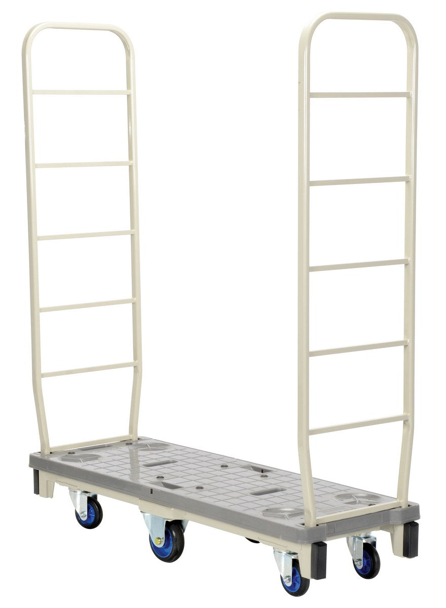 Slim cart with six wheels and narrow platform allows the operator to maneuver through doorways and aisles. Ideal for transporting and stocking small packages in warehouses, shopping malls, grocery stores, post offices, and schools. Plastic platform with steel uprights. The unit rolls smoothly on swivel and rigid heavy duty non marking low noise wheel with high quality ball bearings. Non marking bumpers on front and rear end. Painted finish.
