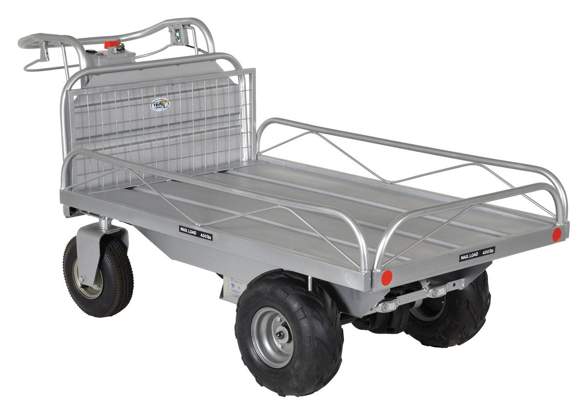 The off-road traction drive powered cart is ideal on the farm or in the factory. Features a robust DC drive motor, batteries with charger and level gauge, low/high speed, LED headlights, wire storage, basket, forward/reverse. Side guards are removable.