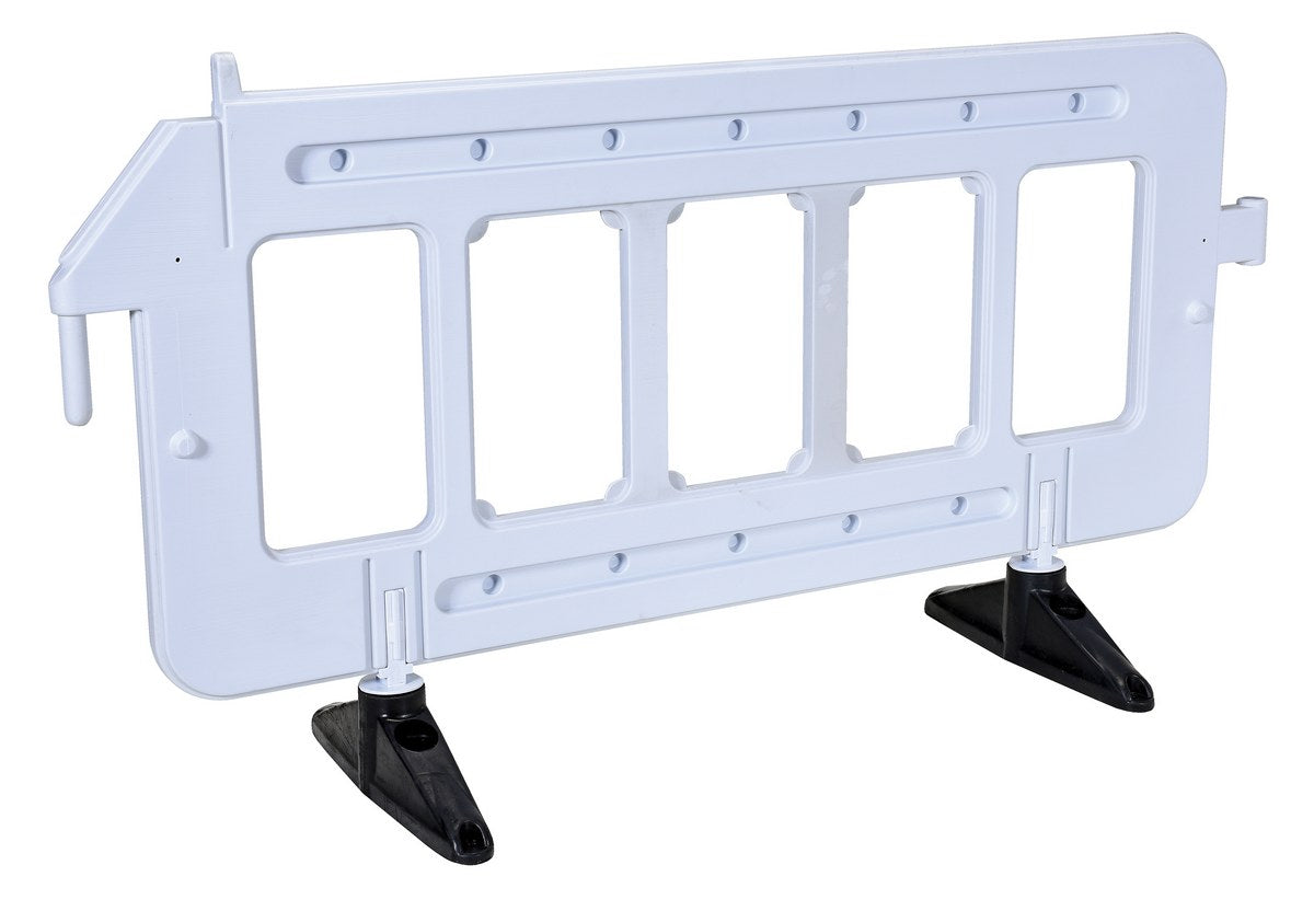 Portable barriers with removable base feet. Manufactured from virgin HDPE material and includes UV stabilizers for longer life. Reflective tape provides better identification at night. The black recycled rubber base feet are weighted for stability.