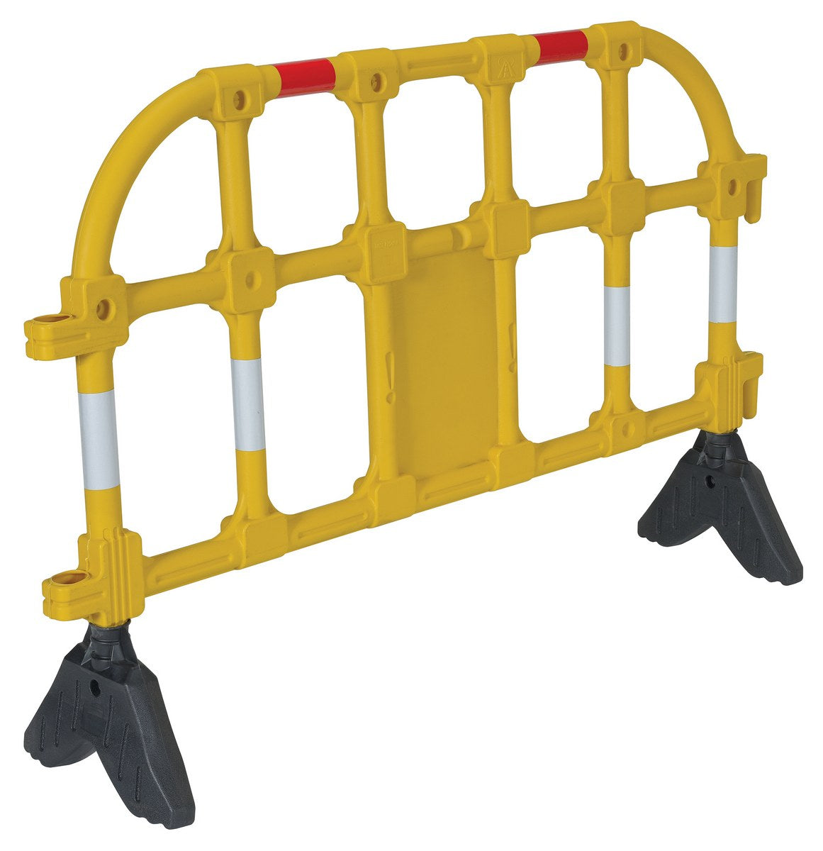 Plastic interlocking barriers will not rust and will retain attractive appearance. Reflective red tape provides better identification at night. Barrier ends include connectors for interlocking multiple units. The non-removable feet come pre-filled with sand for weight ballast. Feet can be rotated to allow for barriers to be stacked. Manufactured from hope material and includes UV stabilizer for longer life. Ships and stores assembled.