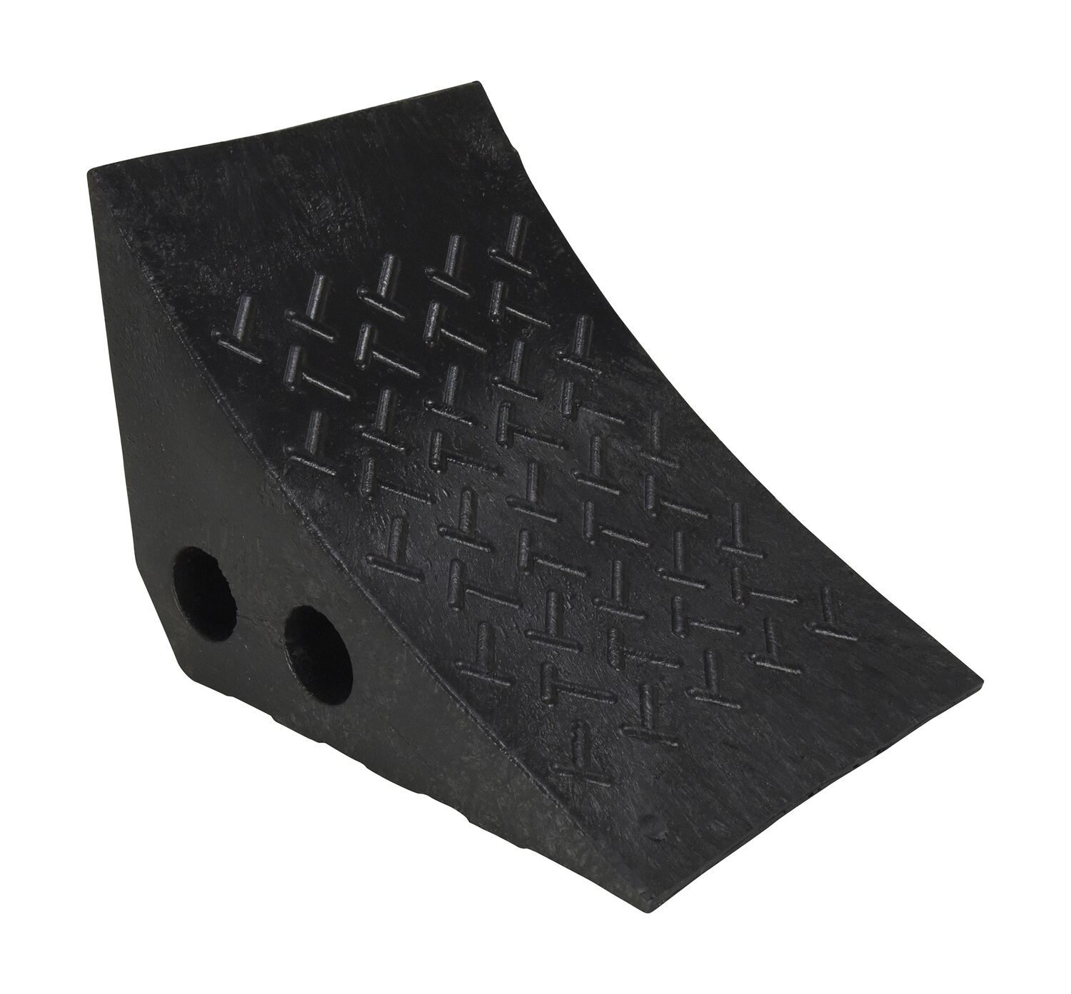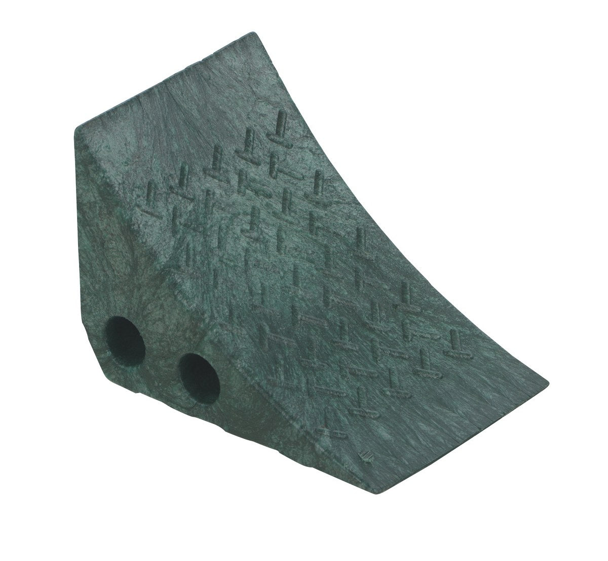 Features a dual slope. One side has a 45 degrees slope while the other side has a 60 degrees slope. 100% Recycled plastic construction is chemical and sunlight resistant and delivers a strong grasp to a number of surfaces. Features a thru hole to accommodate chain attachment.