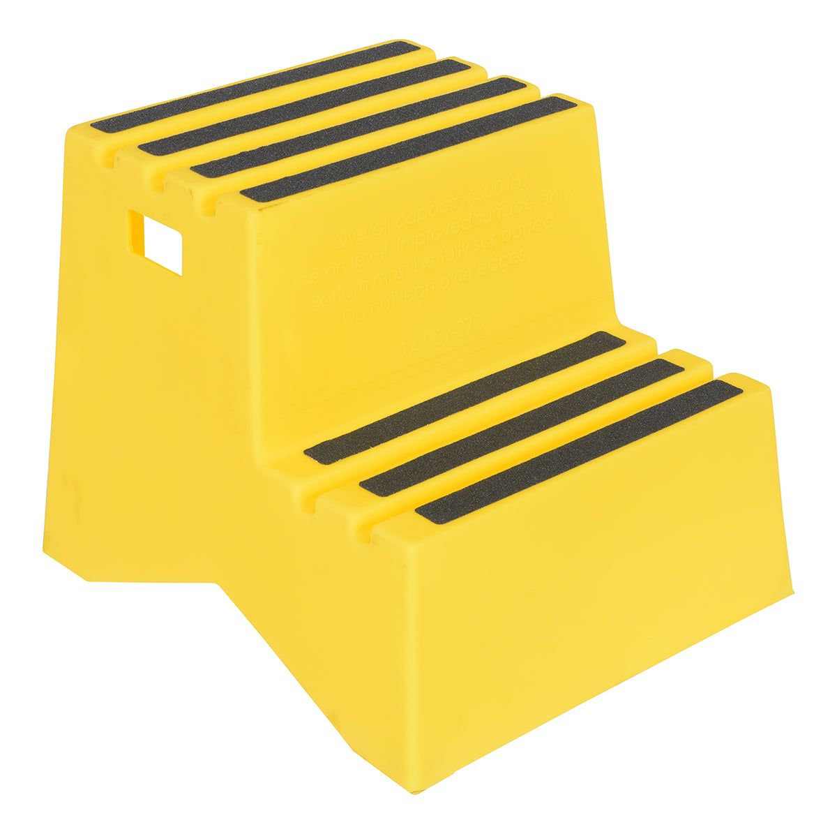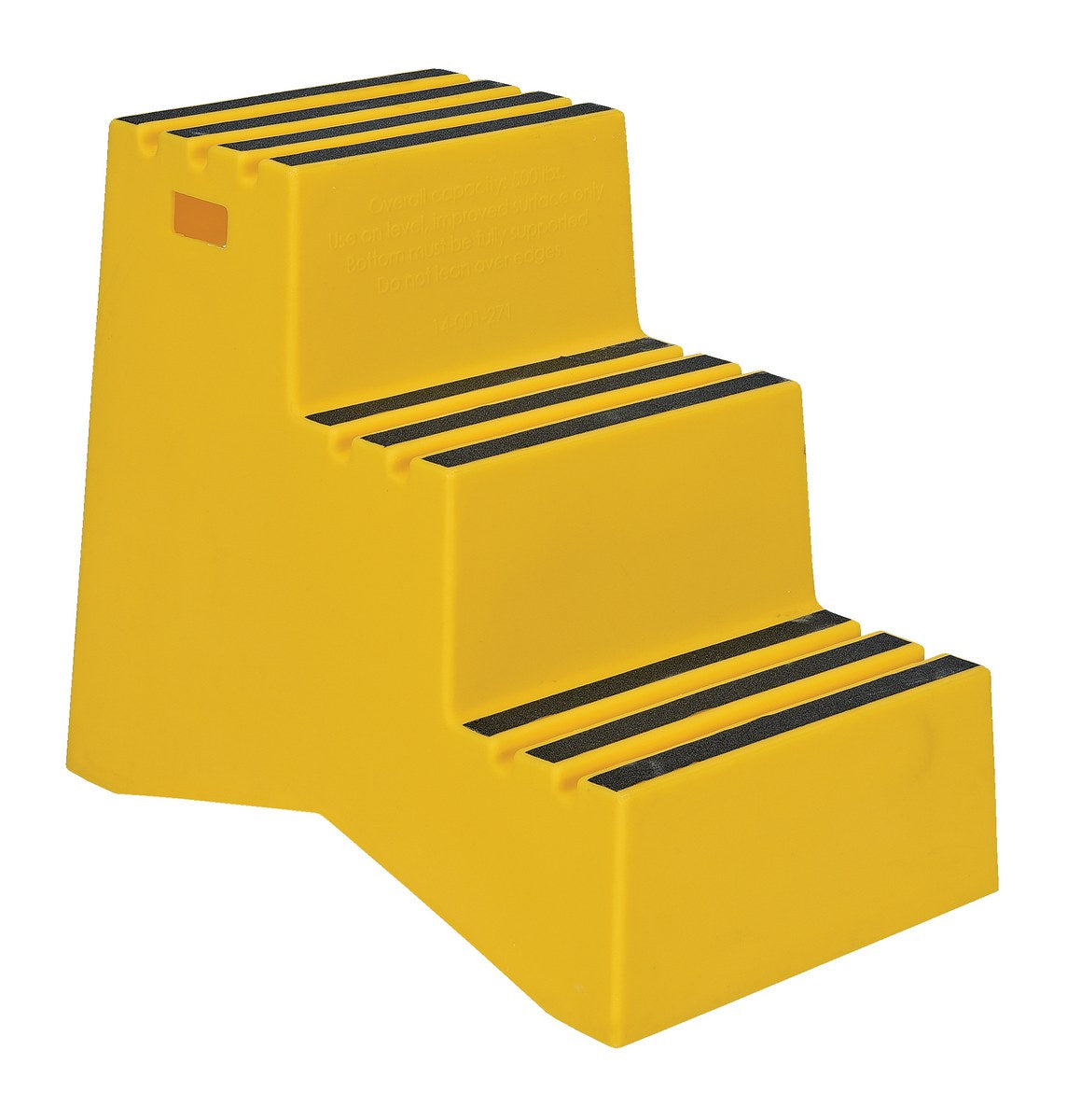When items are out of reach, do not strain, simply step up with this Polyethylene step stool. The three (3) step unit has rear opening access storage compartments. This stool has rubber feet and a non-skid tape surface. Hand holes are standard for easy one person transportation.