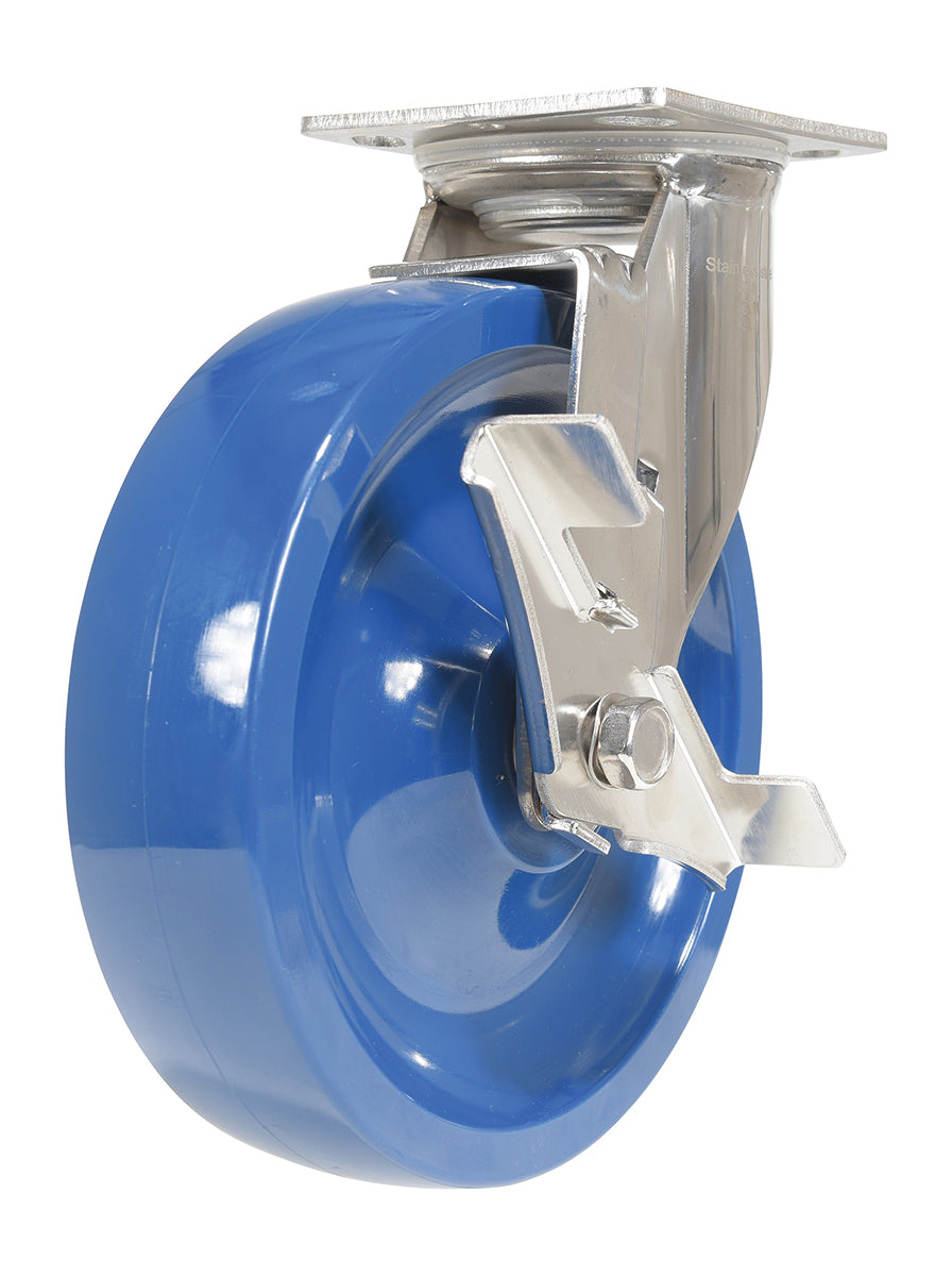 Durastar solid polyurethane wheel is 100% washable and perfect for food processing environments. The wheel is steam cleanable and can resists blood, oil, grease, water and most solvents. The one piece mold design eliminates bonding failure, which provides high impact and abrasion resistant.
