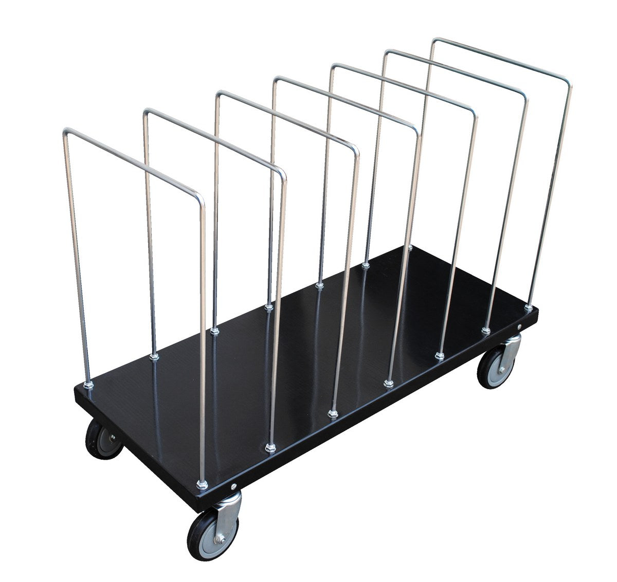 The portable carton cart is designed to store, organize, and transport your empty cardboard boxes. Unit has chrome plated uprights and frame dividers with powder coated black shelves. The cart has adjustable box dividers that are ideal for oversized boxes. The seven dividers can be positioned along the cart deck in any of seven pre-drilled positions. Cart rolls on four swivel (4) poly-on-poly casters.