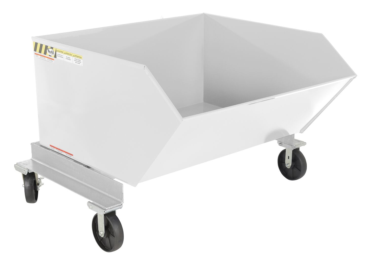 A portable steel Hopper makes handling waste and bulk material safer and more convenient. Fork truck entry openings are designed to move hopper over rough terrain. Foot operated caster lock is included. Unit tilts with assistance from operator while seated on fork truck. Handle for transporting. The included safety restraint should be properly secured to a fork truck before dumping. Welded construction makes them durable. Baked-in powder-coated toughness with galvanized base.