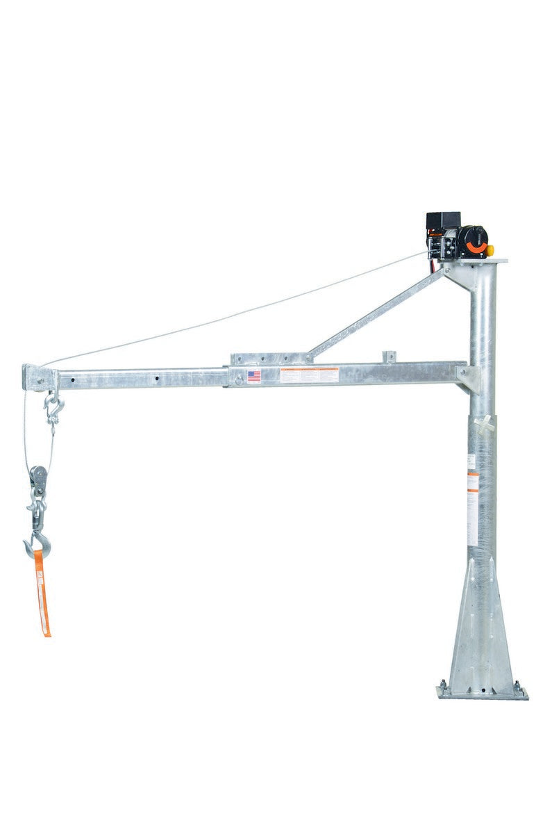 A power lift Jib crane is designed for material handling applications on docks, in warehouses or in truck beds. This intermittent unit uses crane feature rotation hand brakes that offer unlimited positioning. The mast mounts permanently. Boom adjusts in one (1) foot increments and can be positioned at four (4) elevations. Folds for storage. Unit is designed for vertical lifting only. Do not use unit for lifting personnel or overhead lifting.