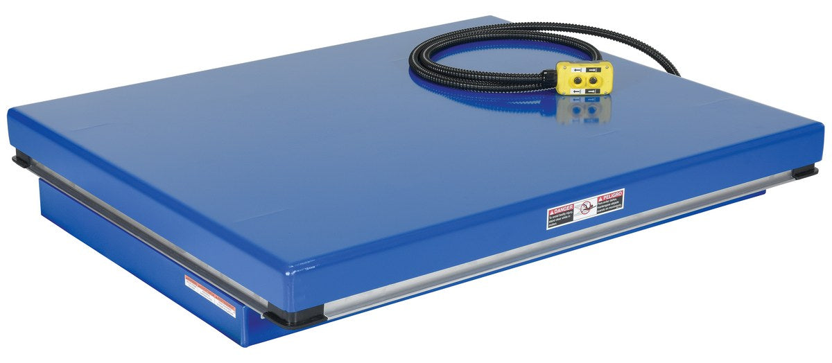 The rotary air/Hydraulic scissor lift table utilizes the convenience of factory air to power the lift table. Simply connect to an air supply through a filter, regulator, lubricator, and you will have a lift table suitable for a wide range of applications and operating environments. It features a pneumatic upper travel limit switch, safety toe guards, cylinder with internal safety velocity fuse, two button hand control, and life-time lubricated sleeve bearings.