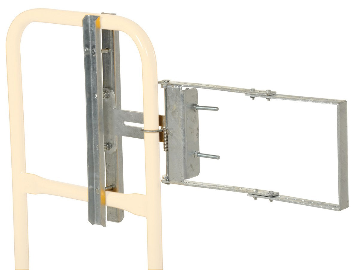 Customize your safety railings with a self-closing steel gate. Gate can be mounted from the left or right with the included mounting hardware. Mount to horizontal rails. Galvanized finish. (Railing and base not included.) Meets OSHA requirements.