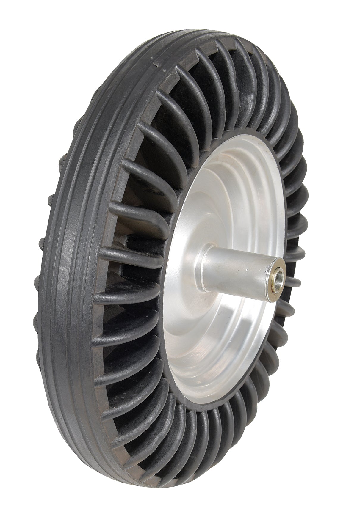 This shock-absorbing wheel with special design for shock absorption properties prevents wheels from bouncing like standard pneumatic wheels. Solid black molded rubber tread will never go flat. Steel hubs (symmetric style for wheel barrels) for maximum strength and precision bearings.