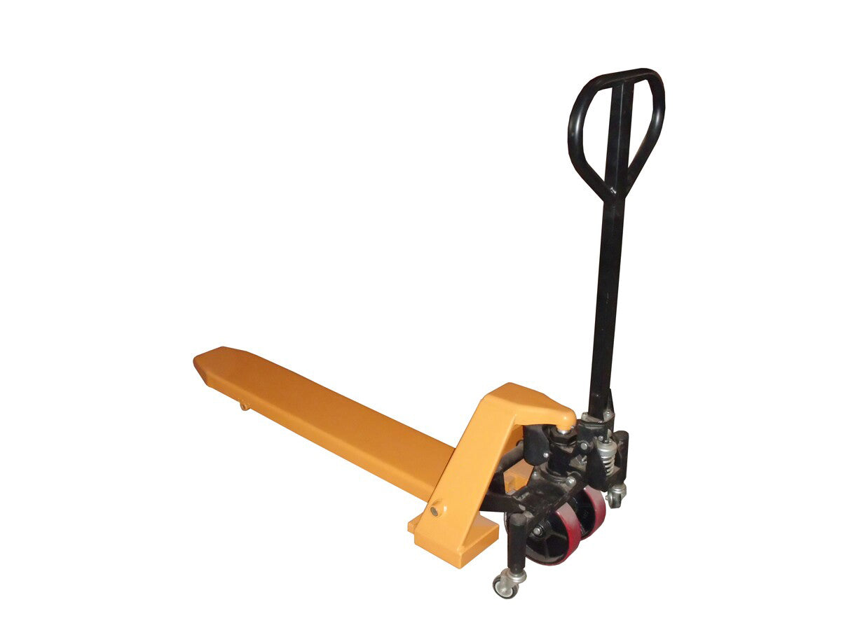 A single fork pallet master is the perfect accessory for maneuvering quarter and half size pallets. The simple hand pump design and lift function allows the user to lift and lower loads quickly. With a sleek powder coat finish baked in to a steel construction, this pallet master has a robust capacity for moving items large and small. The unit rolls on polyurethane casters, great for smoothly traversing a variety of surfaces.