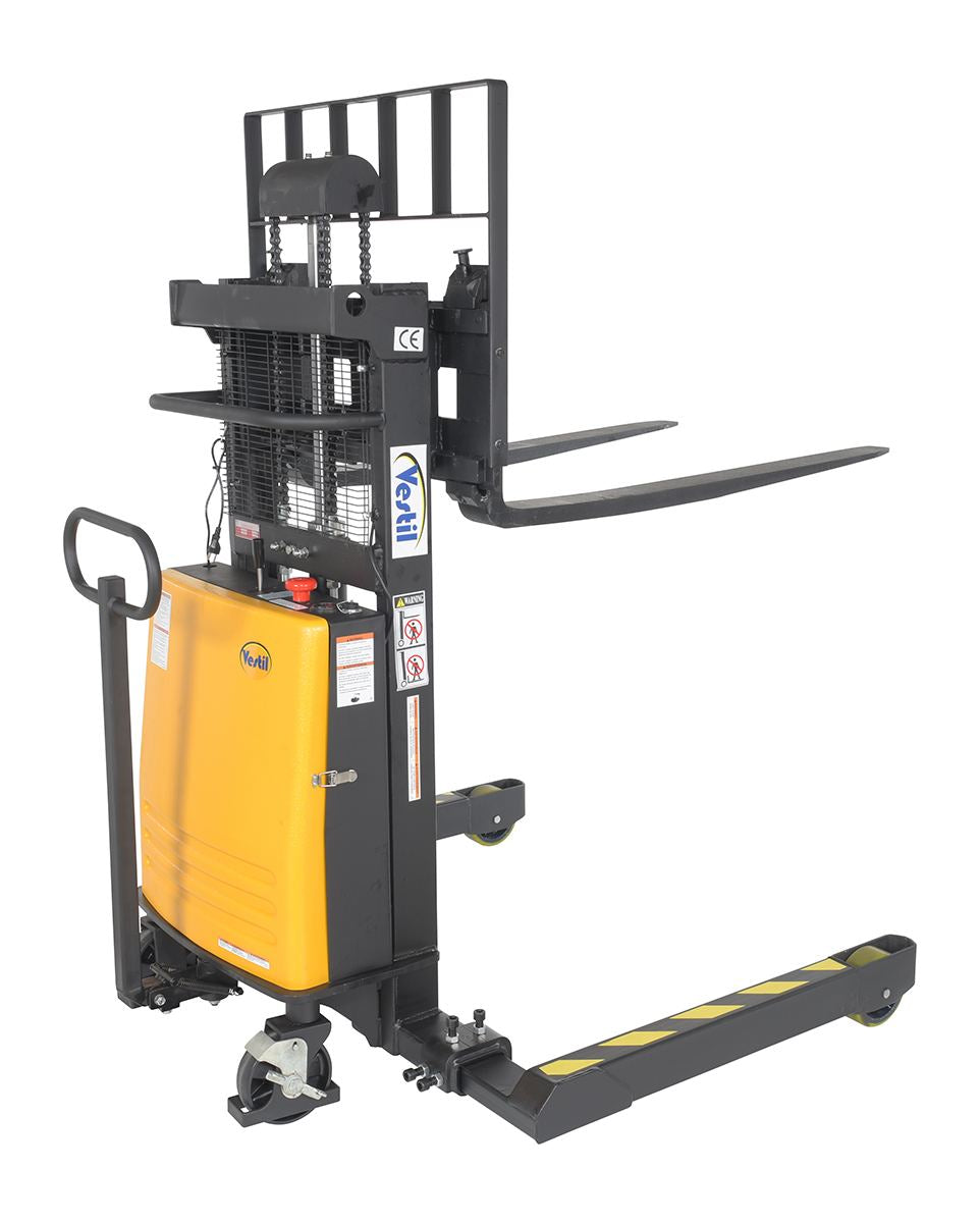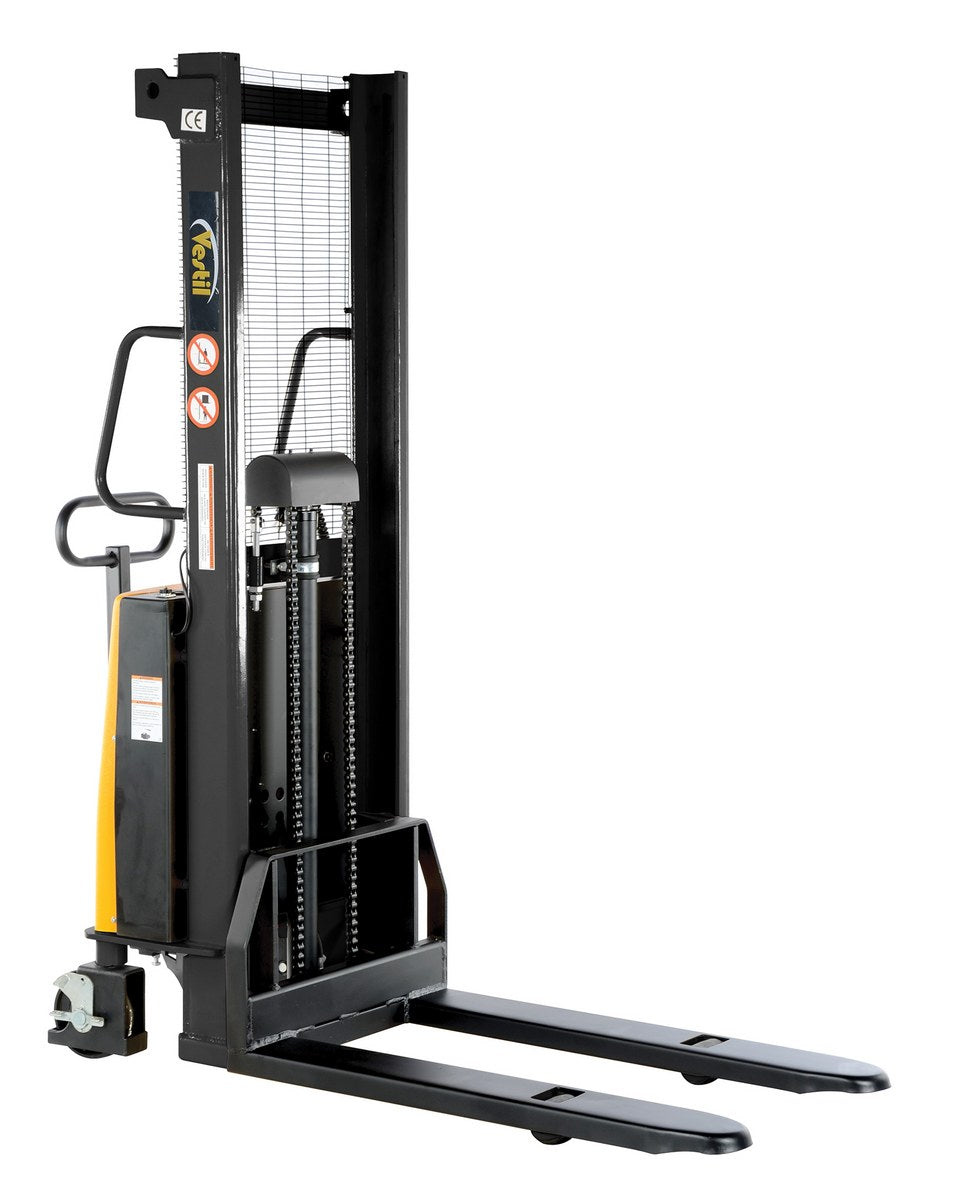 A fully functional electric stacker with a powered lift moves items rapidly and efficiently within warehouse facilities. Heavy-duty tasks are handled by a lift motor with a high torque 24VDC drive.