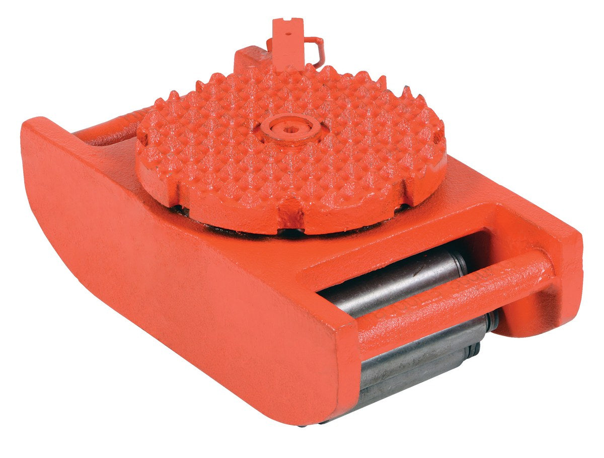 Made of high-strength annealed ductile iron, this steel machine roller has swivel tops that rotate three hundred sixty degrees (360 degrees) on chrome steel ball bearings to allow for easier turning. The rollers form a "tank track" to revolve around a center load bearing plate in the frame to provide maximum maneuverability. The weight of the load is transferred directly from the load bearing plate to the rollers, eliminating axle friction and requiring less power to start and move. This unit is virtually maintenance free.