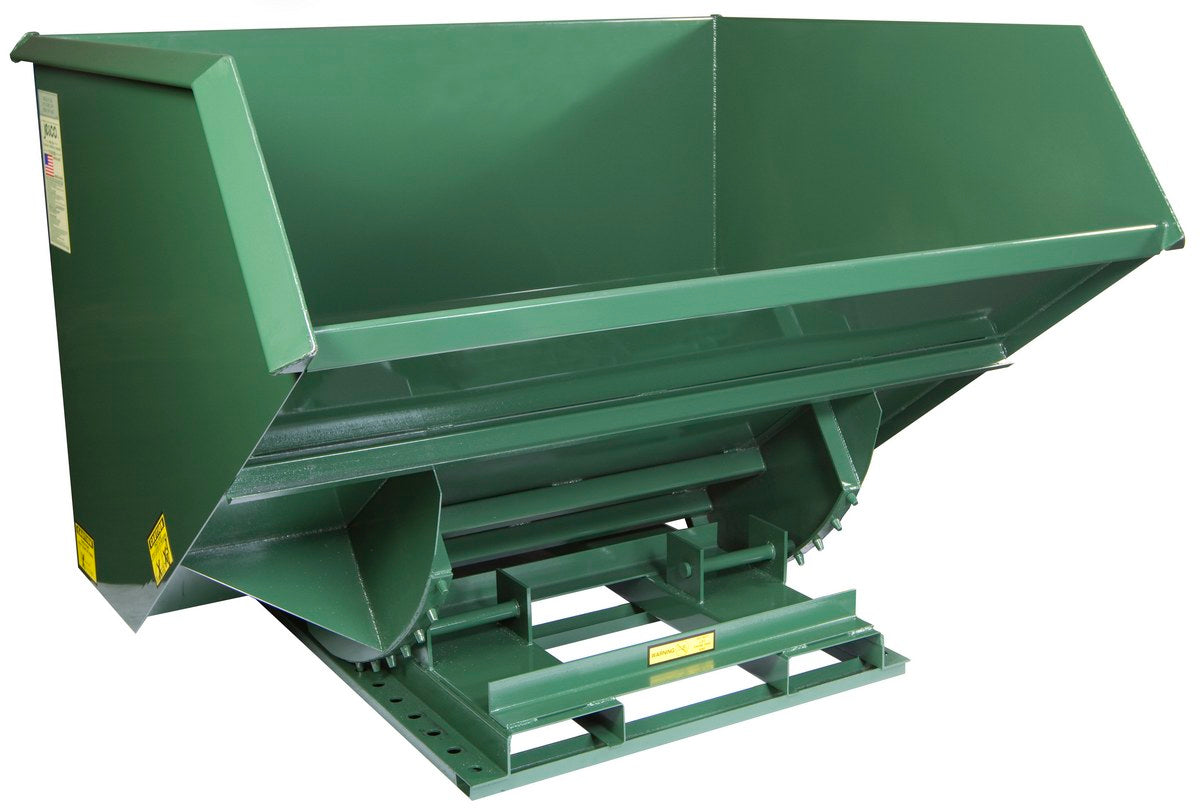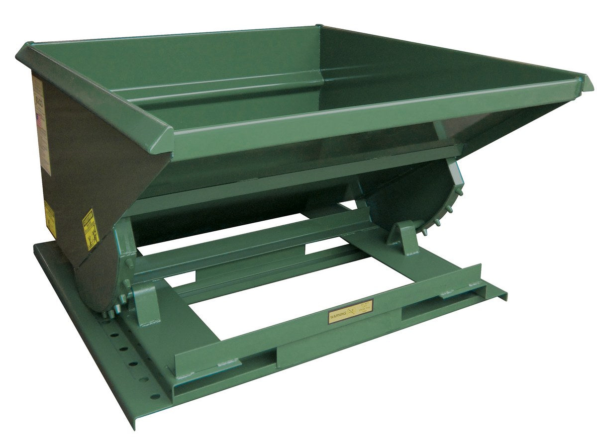 All welded steel self-dumping Hopper handles bulk materials and scrap easily. Must transport and dump with a forklift or make the unit mobile with the optional casters. Self dumping hoppers are engineered to dump when the safety latch is tripped and to return to an upright locked position when empty. This Hopper comes with a trip rope assembly and has a formed stackable base. The included safety restraint should be properly secured to a fork truck before dumping. Standard paint finish is vista green.