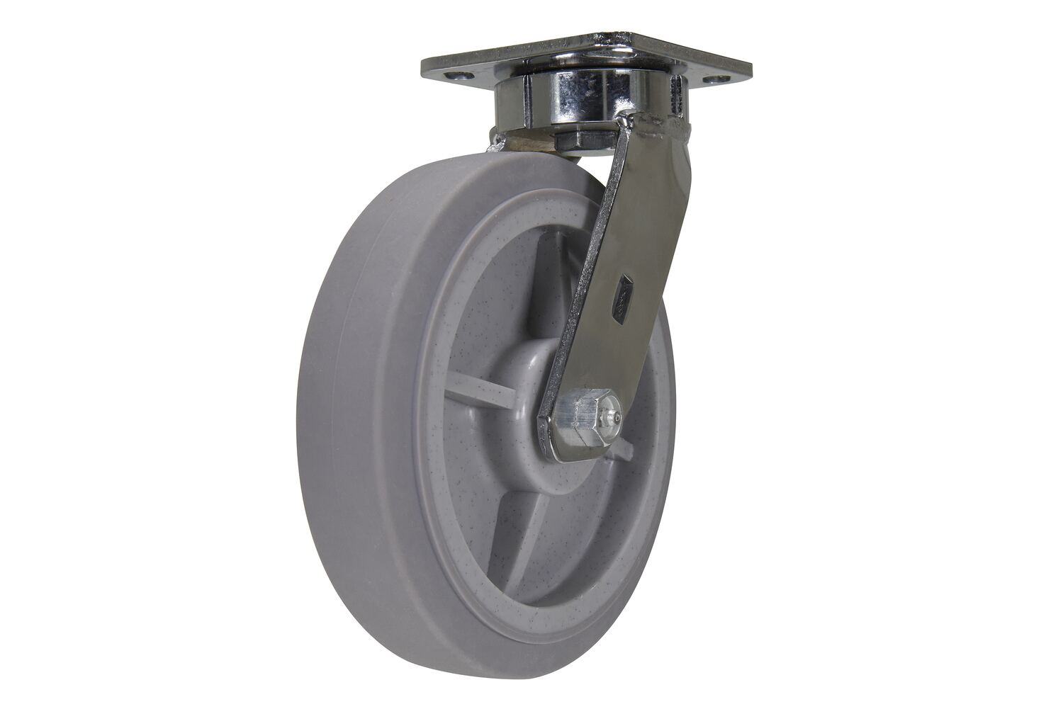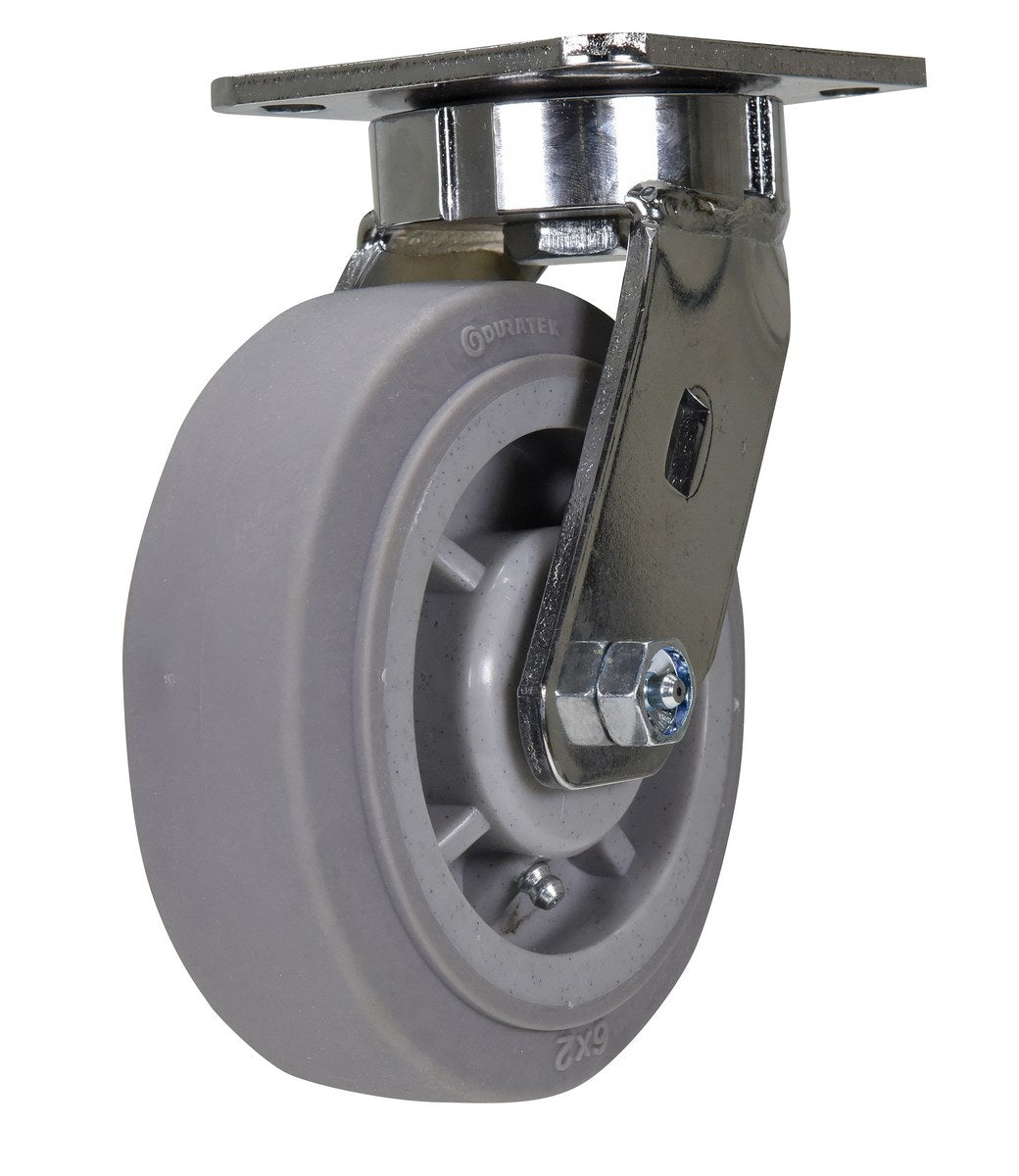 The Duratek wheel is chemically bonded to polyolefin core with the elastomer tread for�quiet rolling�and�impact resistance.�Because of the elastic wheel tread, the Duratek wheel can not only�resist�abrasion,�but also�reduces the force�needed for movement.�It�deflects debris�and�prevents metal shaving from sticking into the wheel�to help keep the wheel clean�and�decrease maintenance�costs.�According to a shopping cart manufacturer 3rd party engineering test (at 3 mph with 245 lbs.), the Duratek wheel can�run over 1000 miles�without fail.