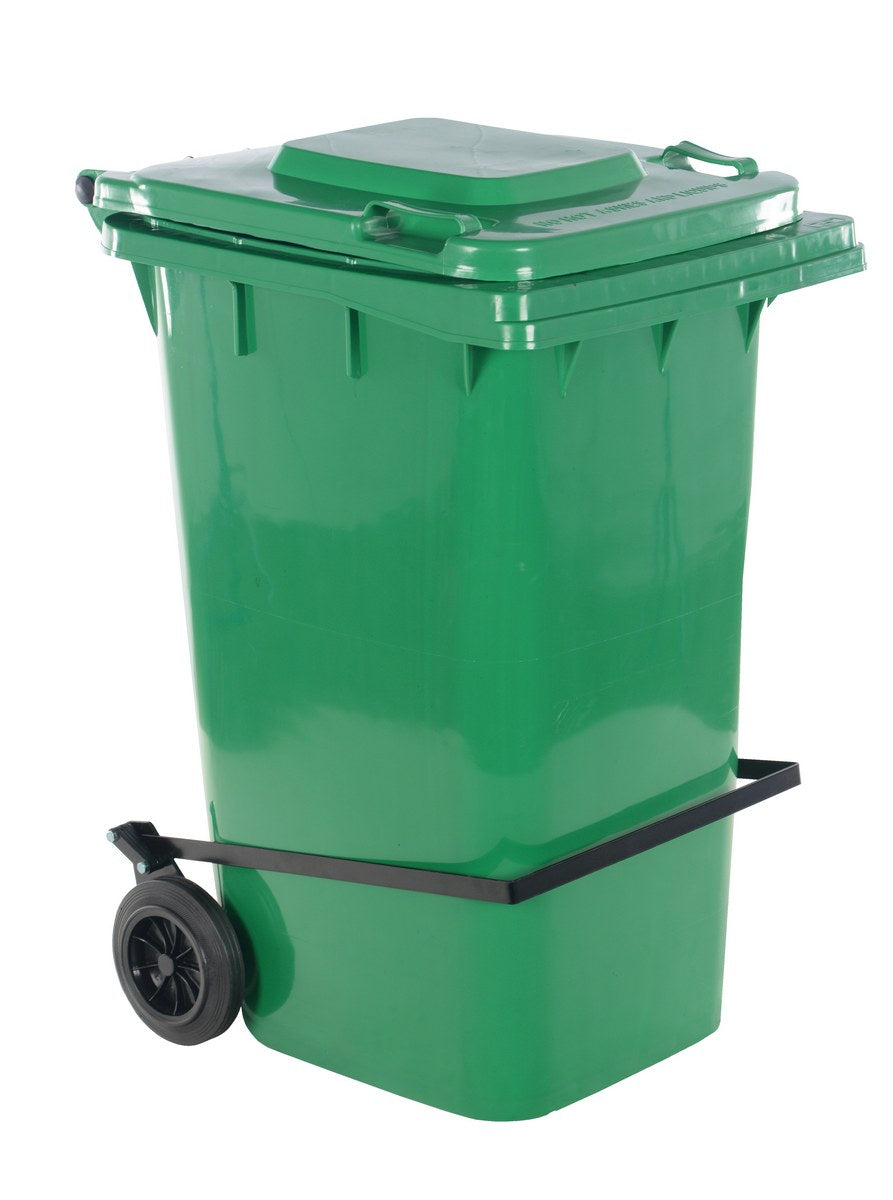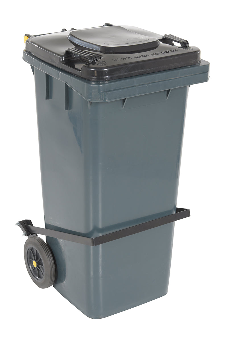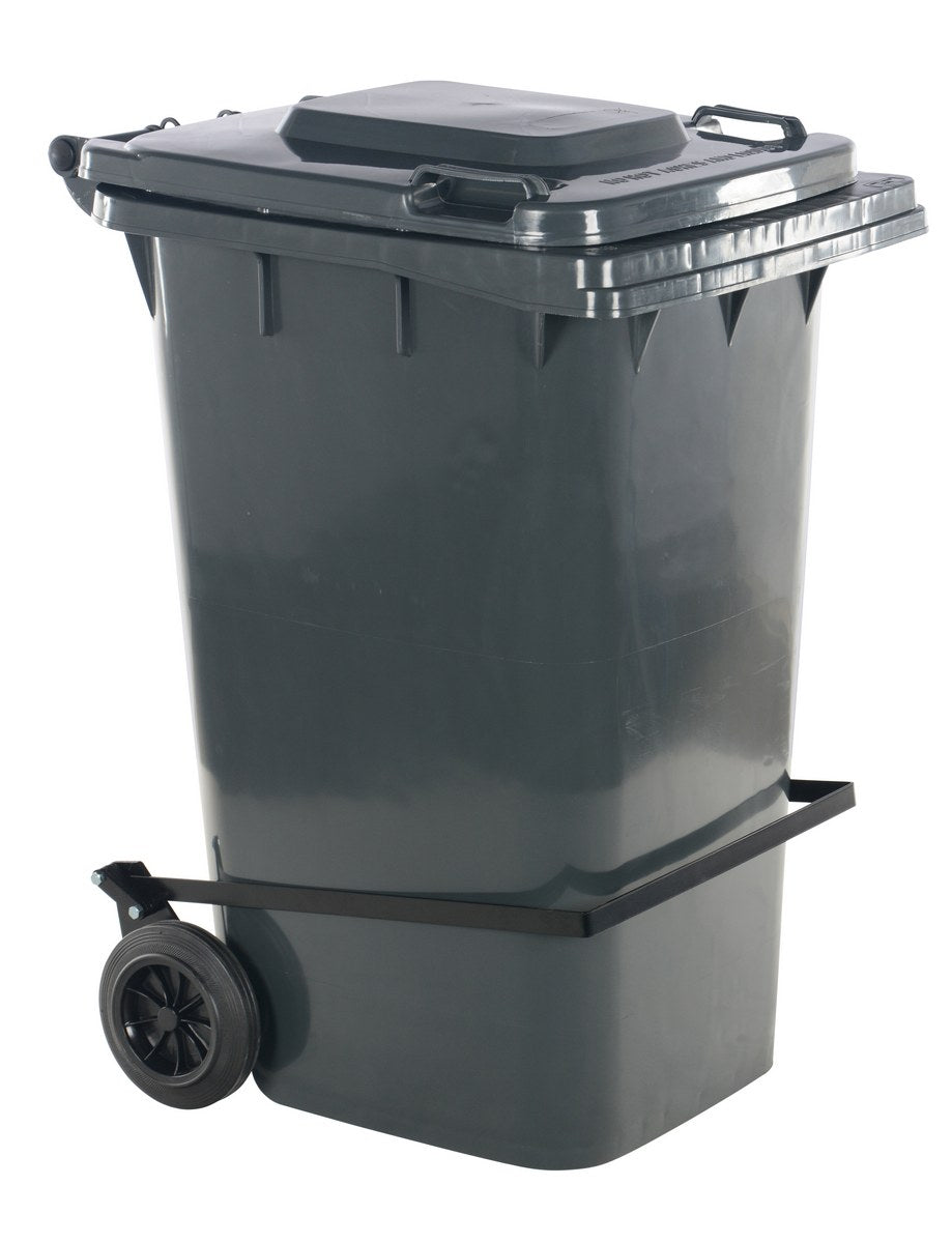 The trash can with metal Foot lid lifter is constructed of durable polyethylene that withstands subzero cold and extreme summer heat. Great for high traffic areas such as: warehouses, fairs, ball parks, schools, etc. Each container includes two wheels for easy portability and hinged lips to keep the rain out. Keep your waste out of eyesight in our heavy-duty and easy to move refuse containers.