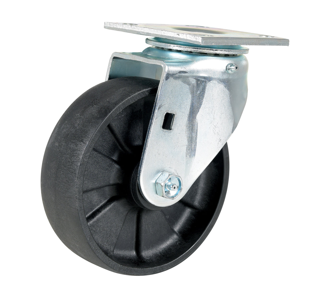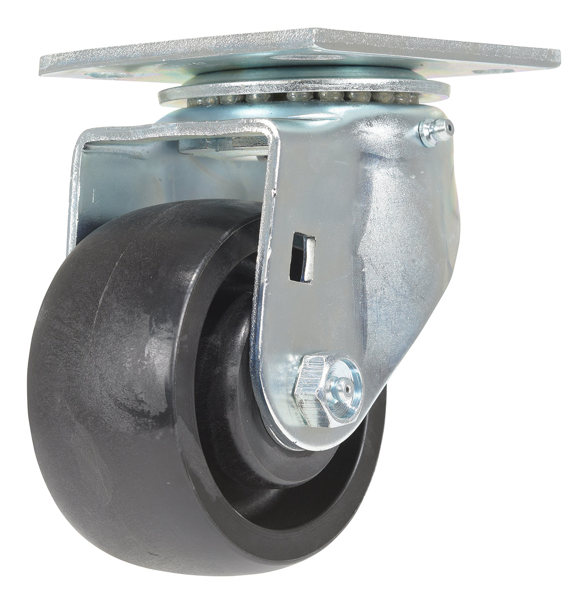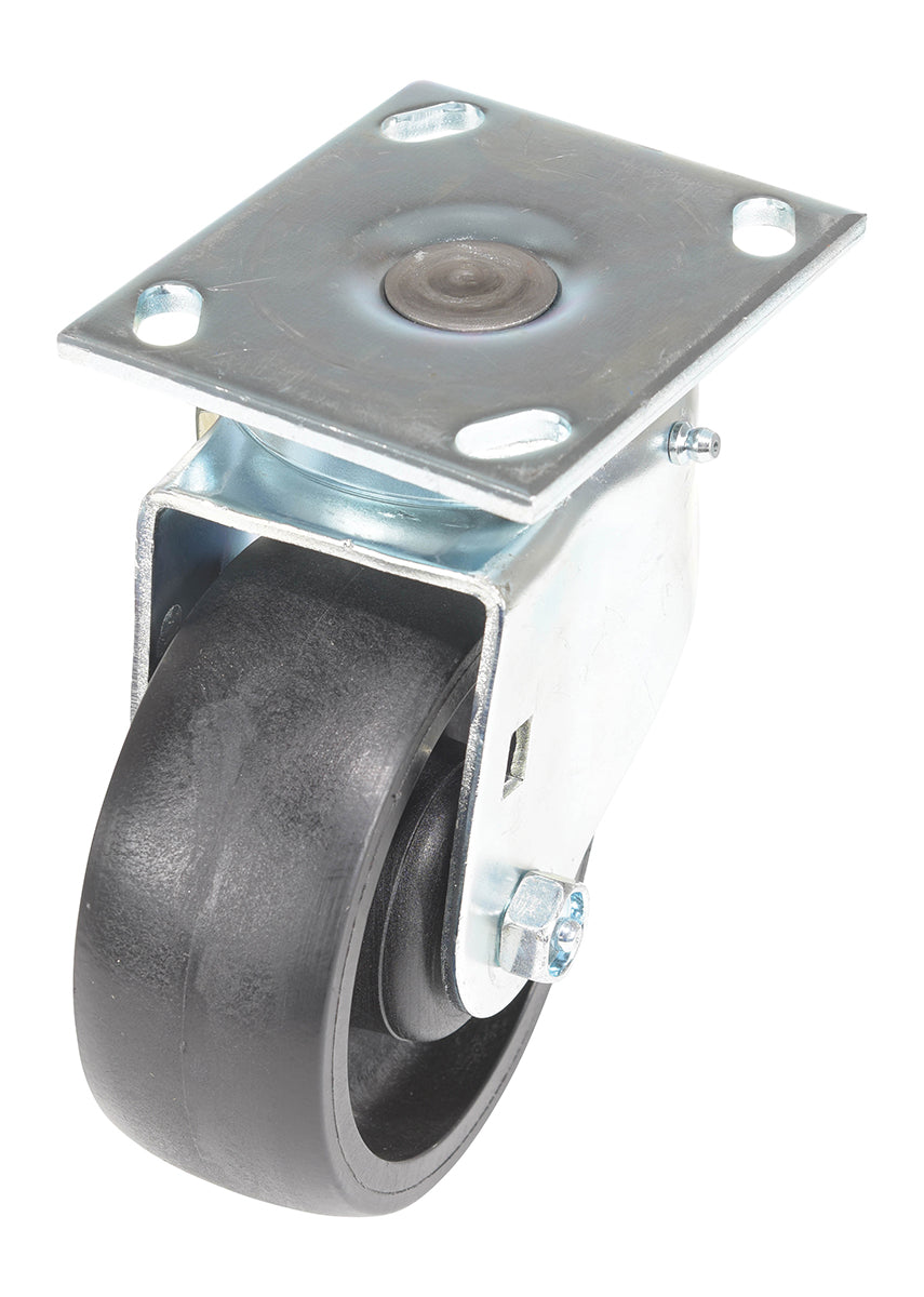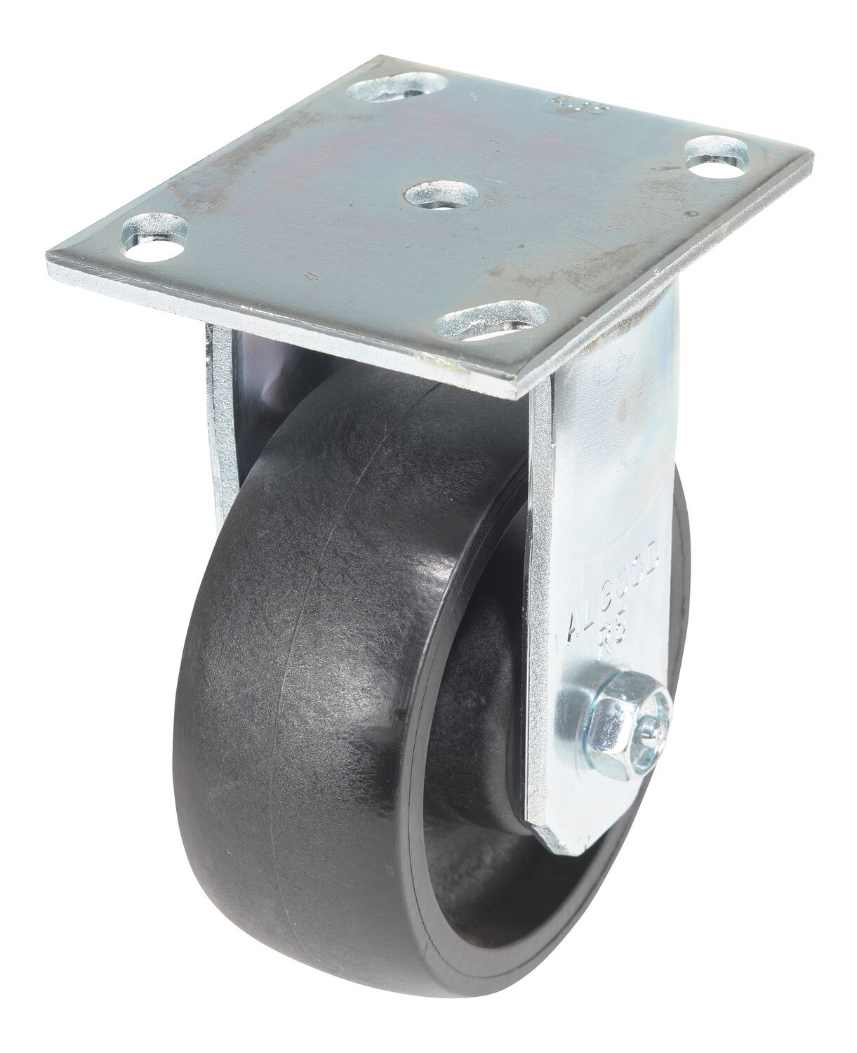 Made of high-tech proprietary glass filled nylon (GFN). Provides better impact resistance than standard glass filled nylon. Does not absorb moisture like phenolic, and offers better floor preservation than steel or cast iron. Resists most chemicals, solvents, gases, acids and steam cleaning. Top plate measures 4 x 4�". Black tread color. 85 (+/-5) Shore D. wheel core material is glass filled nylon RX.
