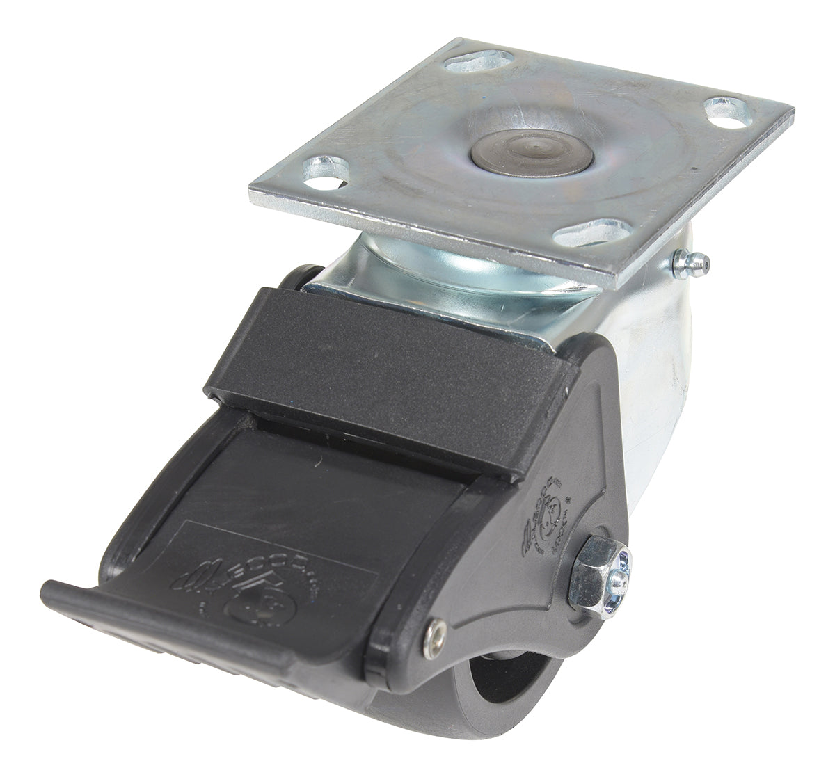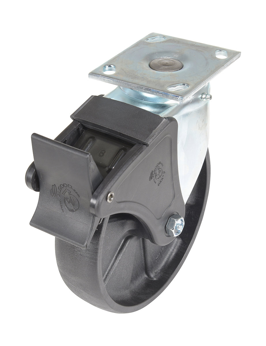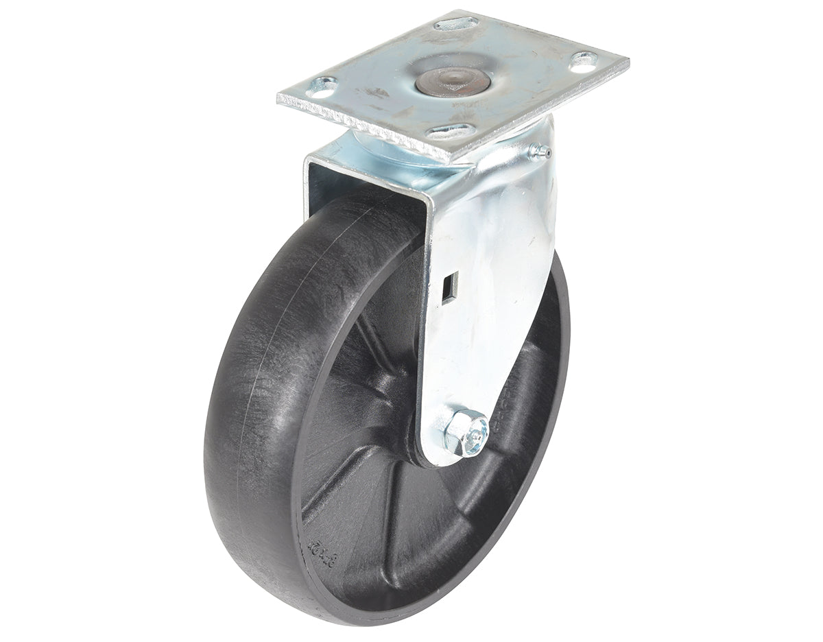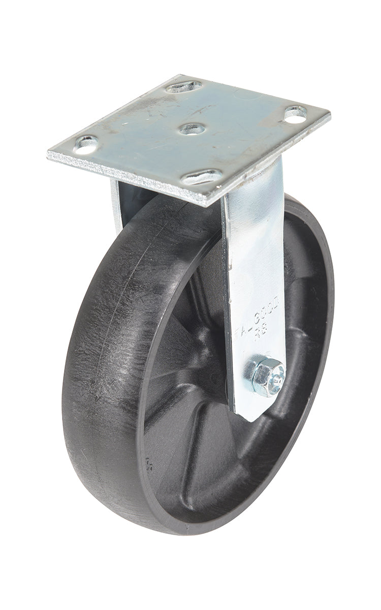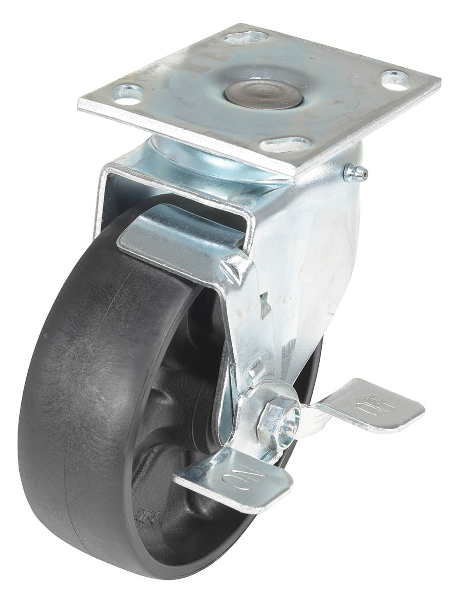 Made of high-tech proprietary glass filled nylon (GFN). Provides better impact resistance than standard glass filled nylon. Does not absorb moisture like phenolic, and offers better floor preservation than steel or cast iron. Resists most chemicals, solvents, gases, acids and steam cleaning. Top plate measures 4 x 4�". Black tread color. 85 (+/-5) Shore D. wheel core material is glass filled nylon RX.