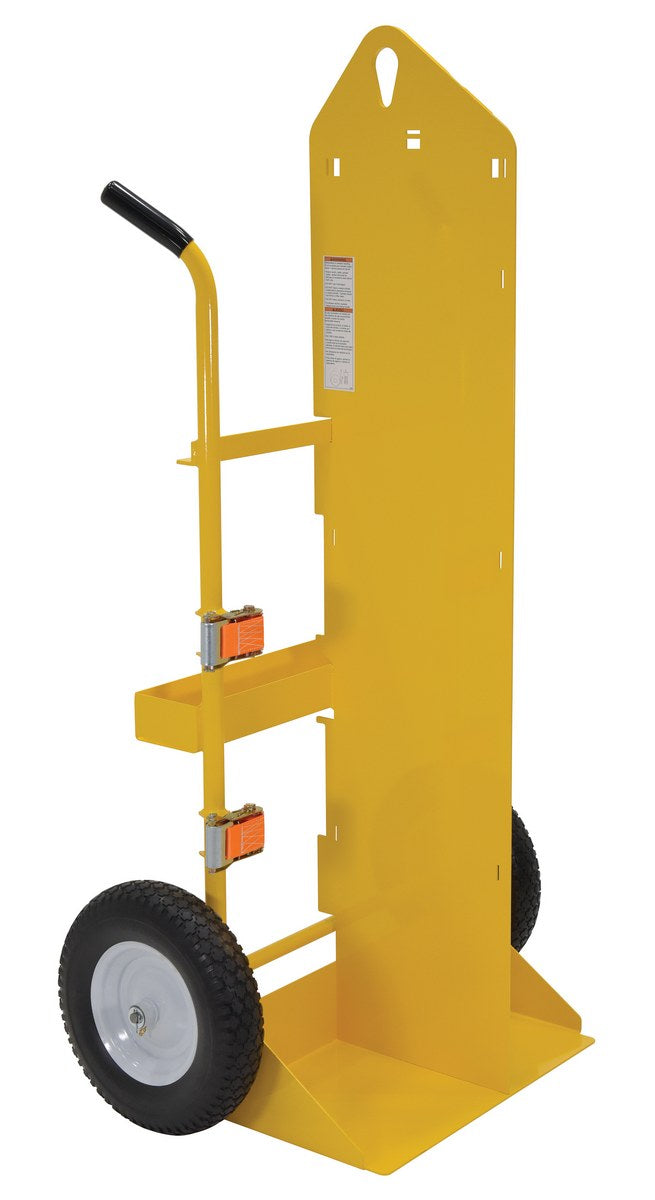 The welding Cylinder torch cart is designed for transporting cylinders and cutting torch. Includes two (2) tank compartments with heavy-duty ratchet straps. Convenient open-top storage tray. Brackets are included for holding cutting torch and hose. Sturdy handles and large wheels for tilt-n-go portability. Welded steel construction with powder coat finish. Not designed for use as a storage means for gas cylinders.